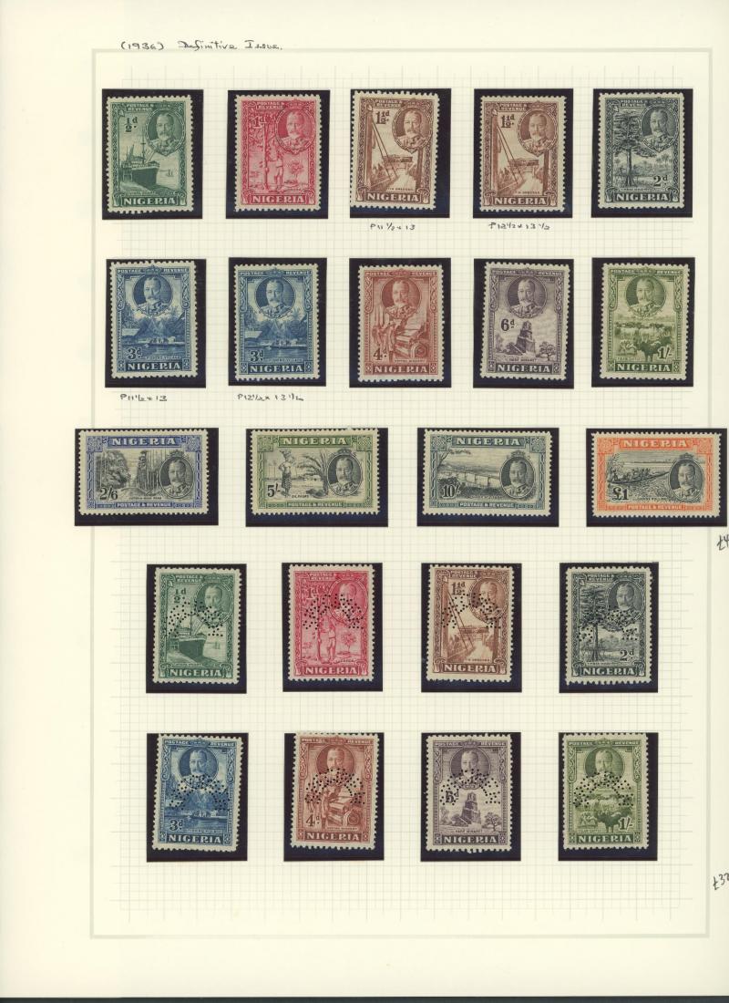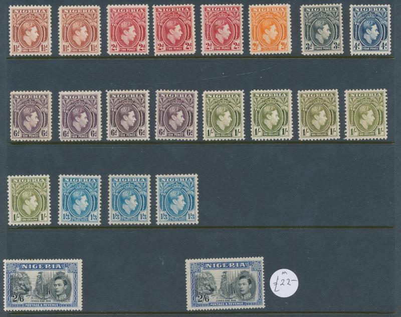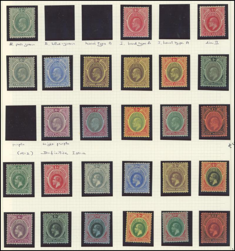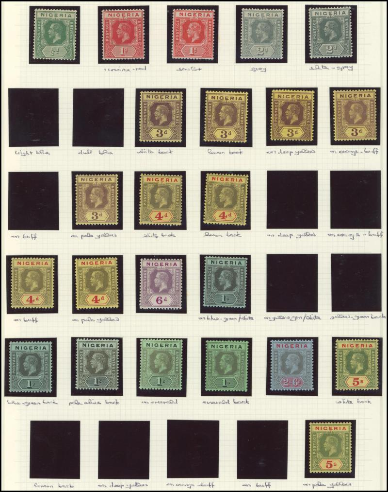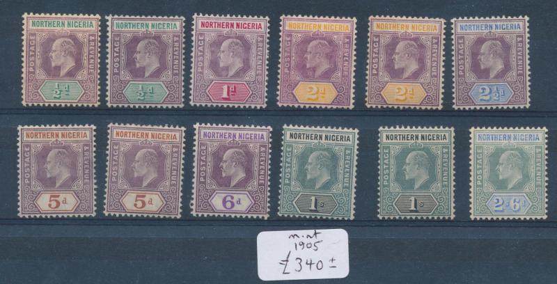 complete including extra shades noted Crown CA Wmk 10/- violet x3, Northern Nigeria resonably complete including QV 10/- x2 plus QV 'SPECIMEN' overprints set (ex 10/-), Southern Nigeria 1901 QV set plus 'SPECIMEN' overprints, 1903-04 KEVII Crown CA