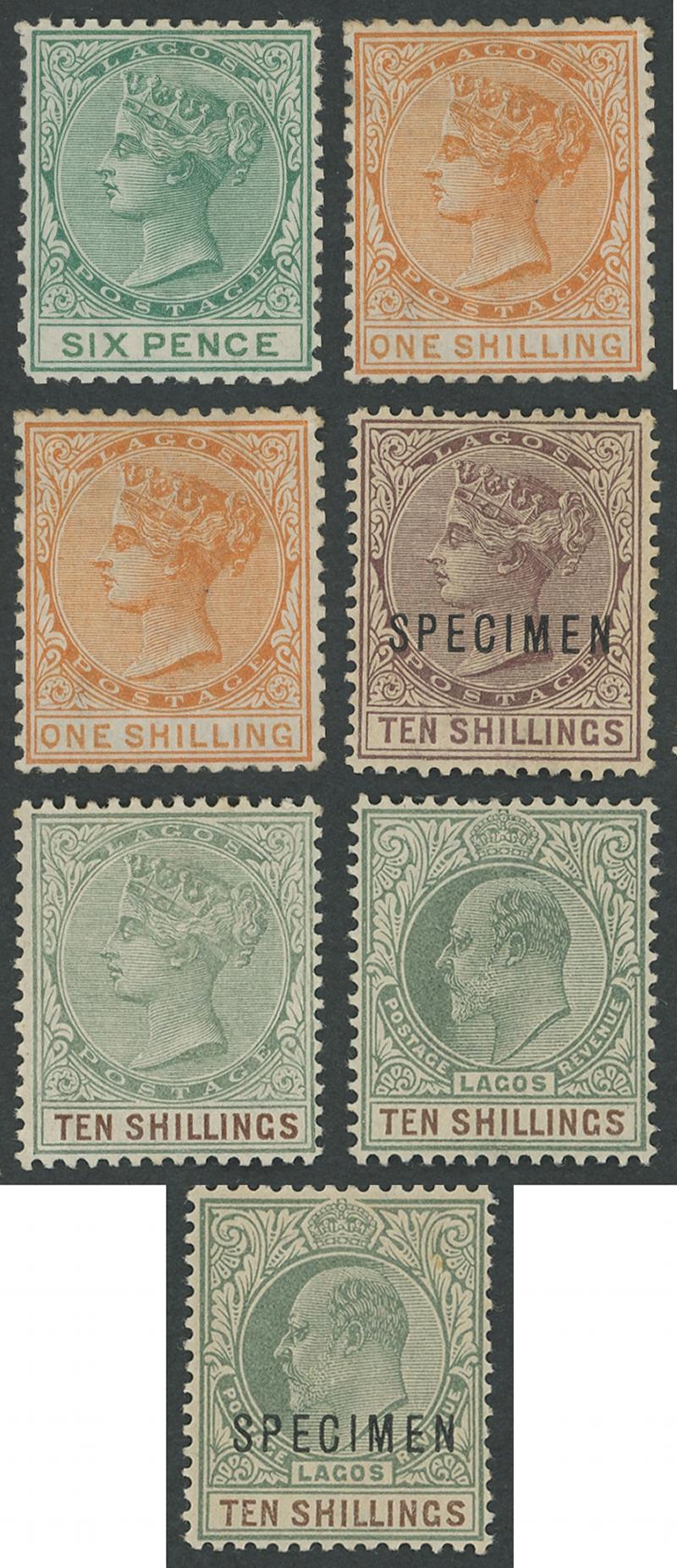 LAGOS: Mint selection from 1874-75 QV Crown CC Wmk Perf 12½ 1d violet, 6d green & 1/- orange and 1876-79 Perf 14 1d violet, 2d blue
