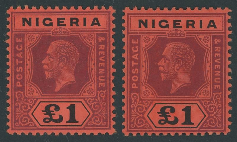 1914-29 KGV Multiple Crown CA Watermark £1 deep purple & black/red Die II and £1 purple & black/red Die II SG 12b & 12ba, both