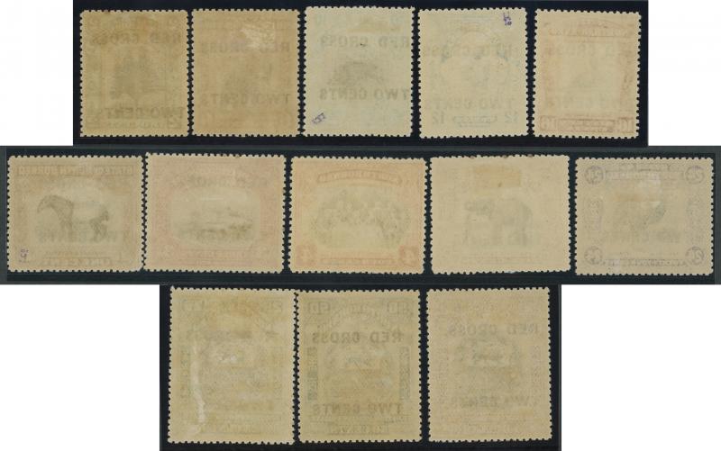 1918 'RED CROSS/TWO CENTS' Charity Surcharges on Pictorials & Arms 1c to $10 set (ex 8c) SG 214-234, the 2c with Wide Setting, a