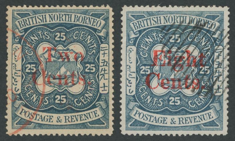 1890-92 Surcharges on Arms in red on 25c indigo 'Two/Cents.' & 'Eight/Cents.' SG 51 & 52, the first with small-part cds cancel in