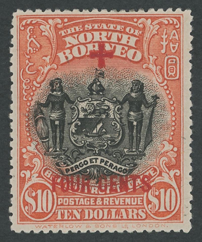 1918 Red Cross 'FOUR CENTS' Charity Surcharges on Pictorials & Arms $10 black & brick-red SG 252, very lightly mounted, Cat £475. (Image1) (Image2)