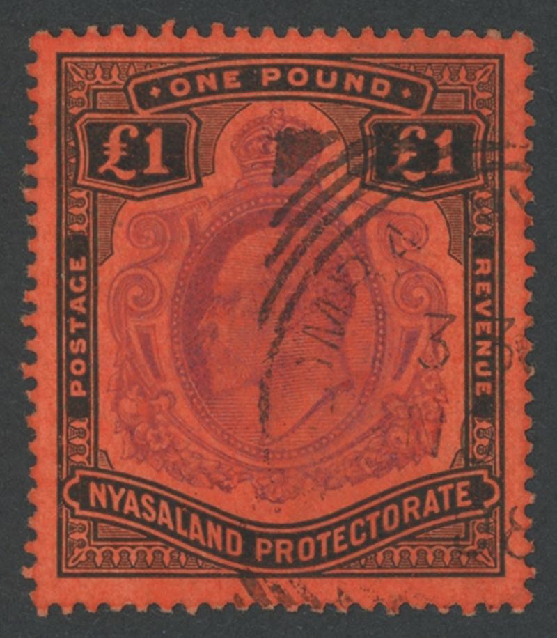 1908-11 KEVII Keyplates £1 purple & black/red SG 81, quite well-centred, light partial 'ZOMBA/ NY[ASALAND]' 1908 Squared Circle