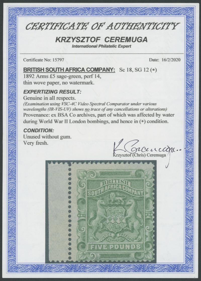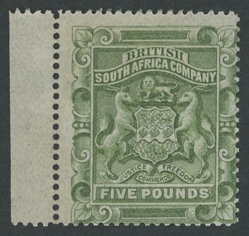 1892-93 British South Africa Company Arms £5 sage-green SG 12, marginal example from the left-hand side of the sheet, unused, Cat