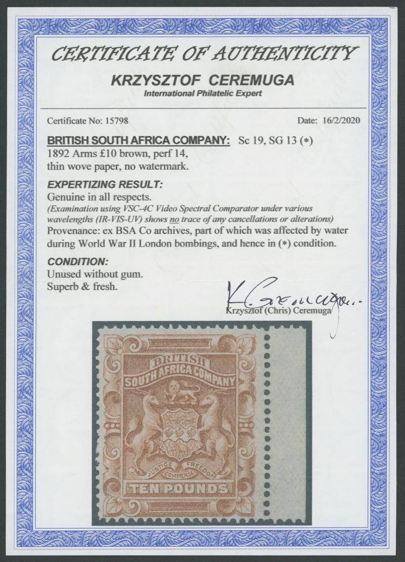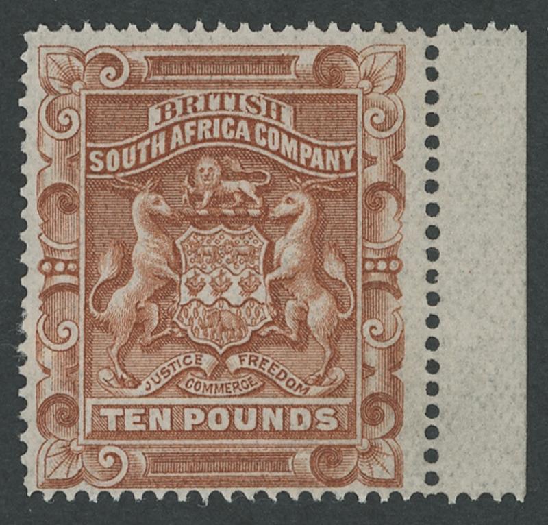 1892-93 British South Africa Company Arms £10 brown SG 13, marginal example from the right-hand side of the sheet, unused, Cat
