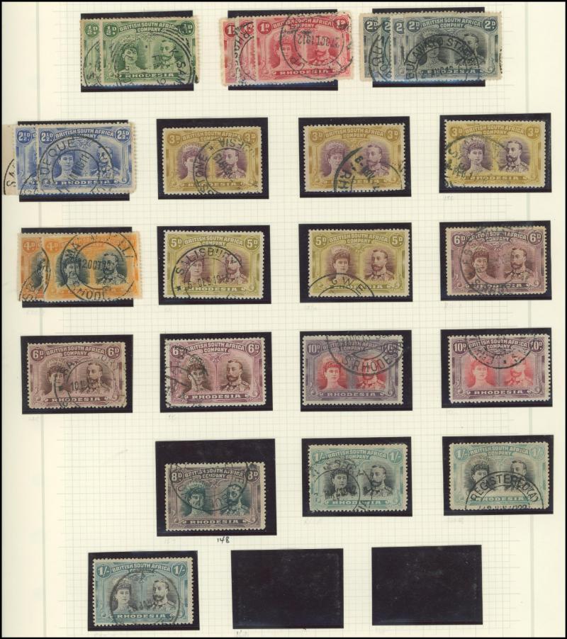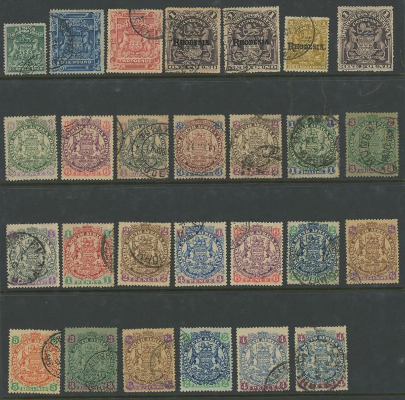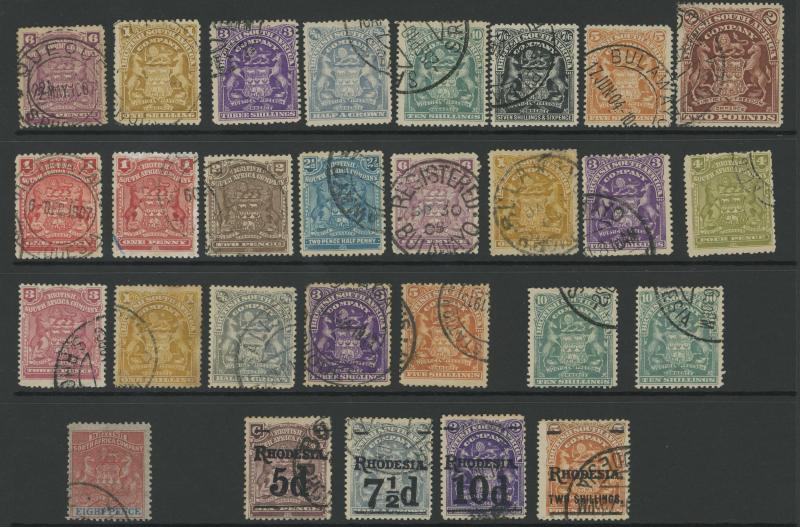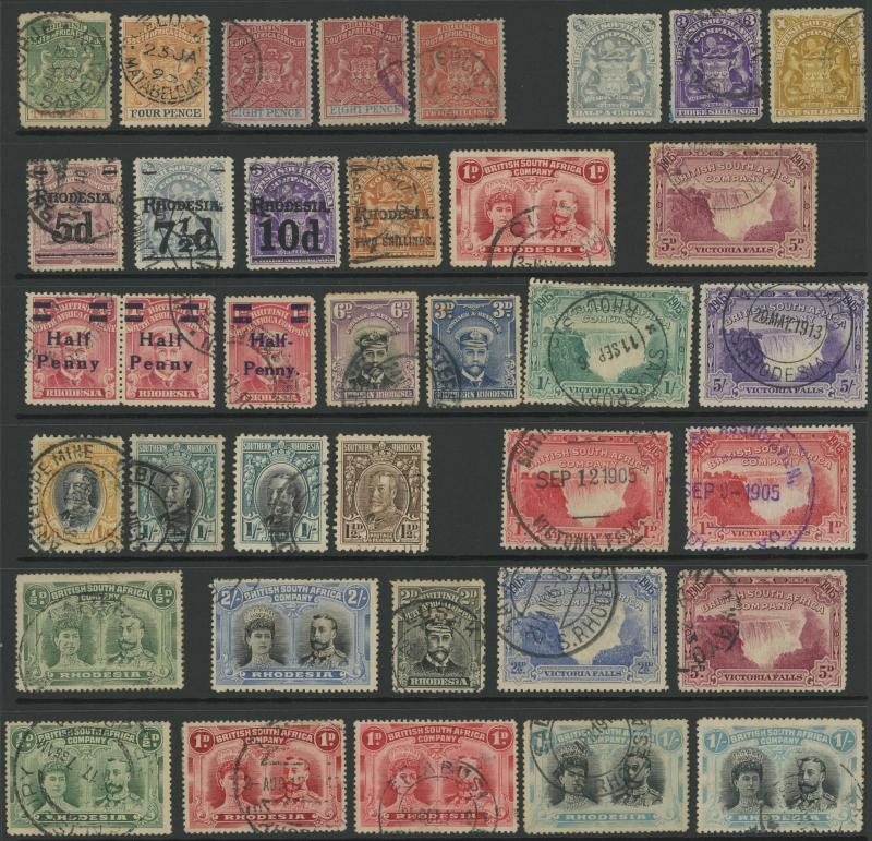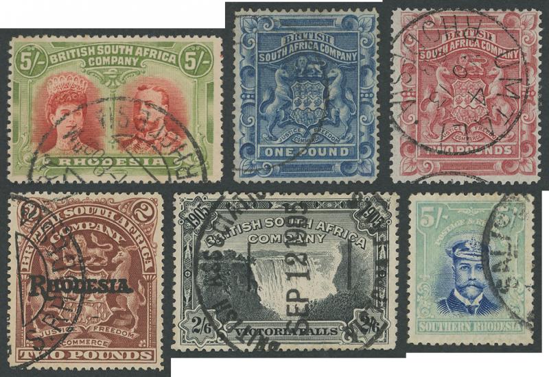 lightly duplicated range with 2/6d x2 & 3/- x2, 1898-1908 Monocolour Arms 5/- orange, 7/6d black & £1 purple and 'Rhodesia' overprints £1 purple x2 & £2 brown, 1905 Victoria Falls set (the 1d & 2/6d with British Association Victoria Falls cancels),