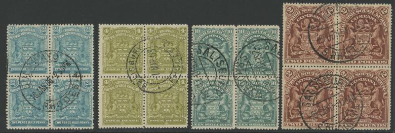 Used selection to 1920s including 1892-93 BSAC Arms 2/- vermilion, 10/- green , £1 blue x2 & £2 rose x2, 1896-97 Bi-Coloured Arms