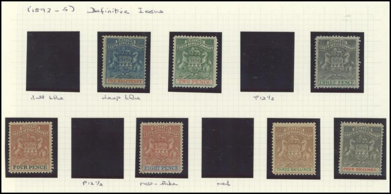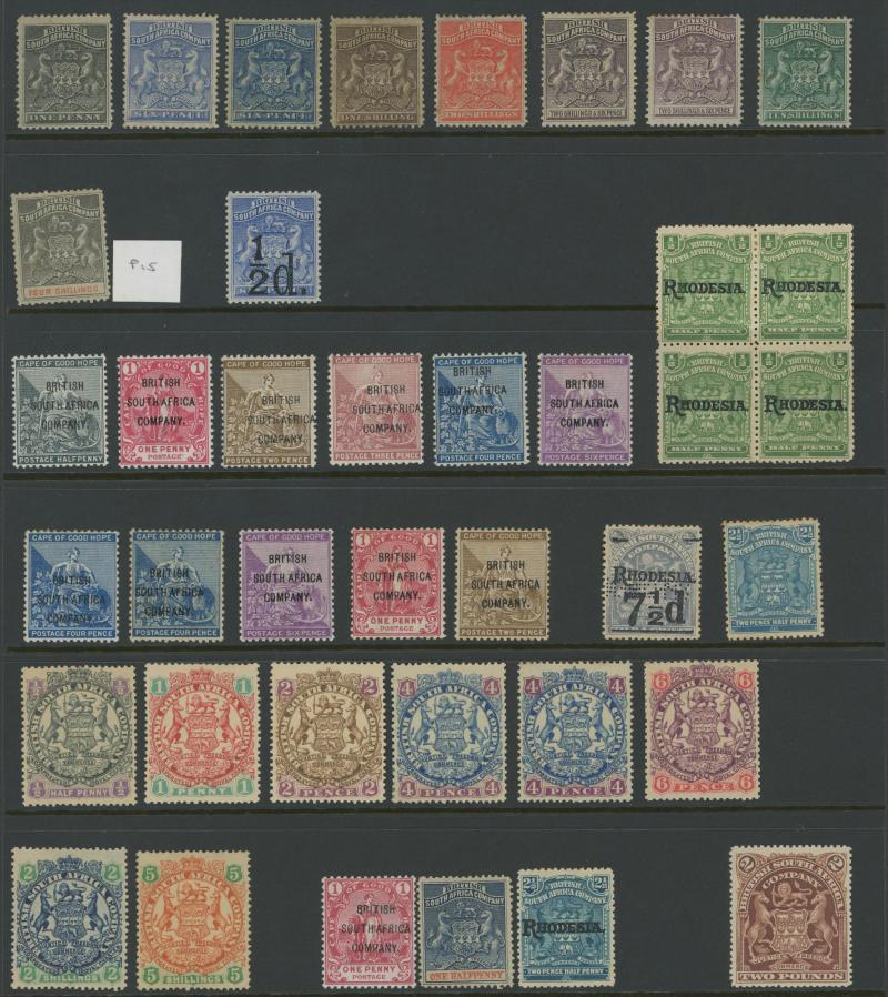 on 6d & 8d on 1/-, 1892-94 Bi-Coloured Arms set plus extra 3/- & 4/-, 1896-87 Large Arms Shaded Lion set to 5/-, 1896 Matabele Surcharges 'THREE/PENCE' on 5/- and Overprints on Cape of Good Hope set plus extra 4d x2 & 6d, 1898-1908 Monocolour Arms £1