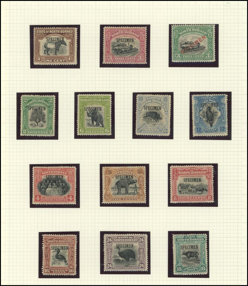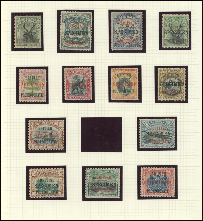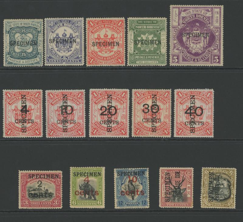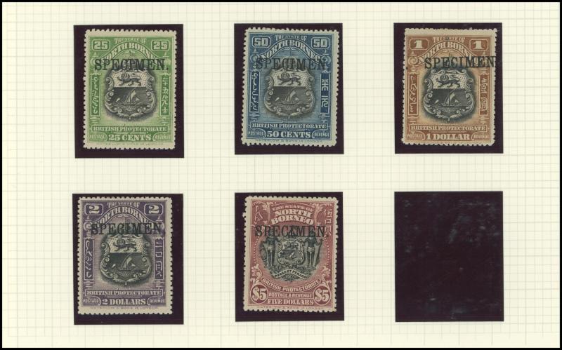 SPECIMEN STAMPS: Selection of 'SPECIMEN' overprints including 1894 Arms 'State of North Borneo' set SG 81s-86s, 1995 '4/CENTS'