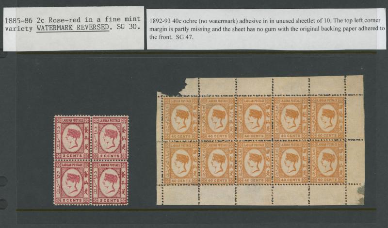 LABUAN: Queen Victoria 1880s-90s selection including 1885 Crown CA Wmk 2c rose-red with the Watermark Reversed block of 4 **,