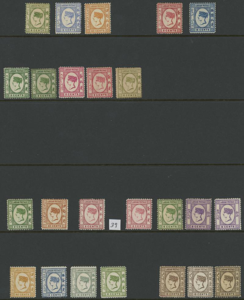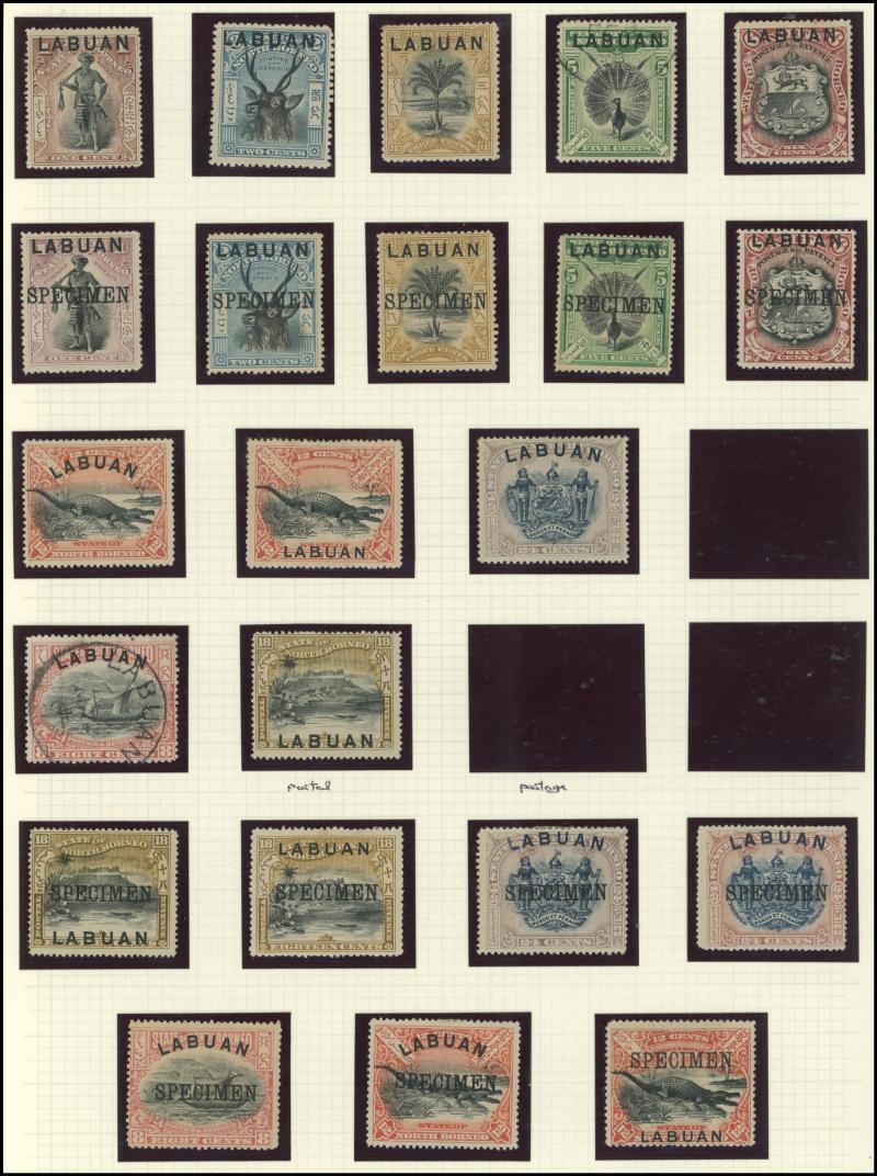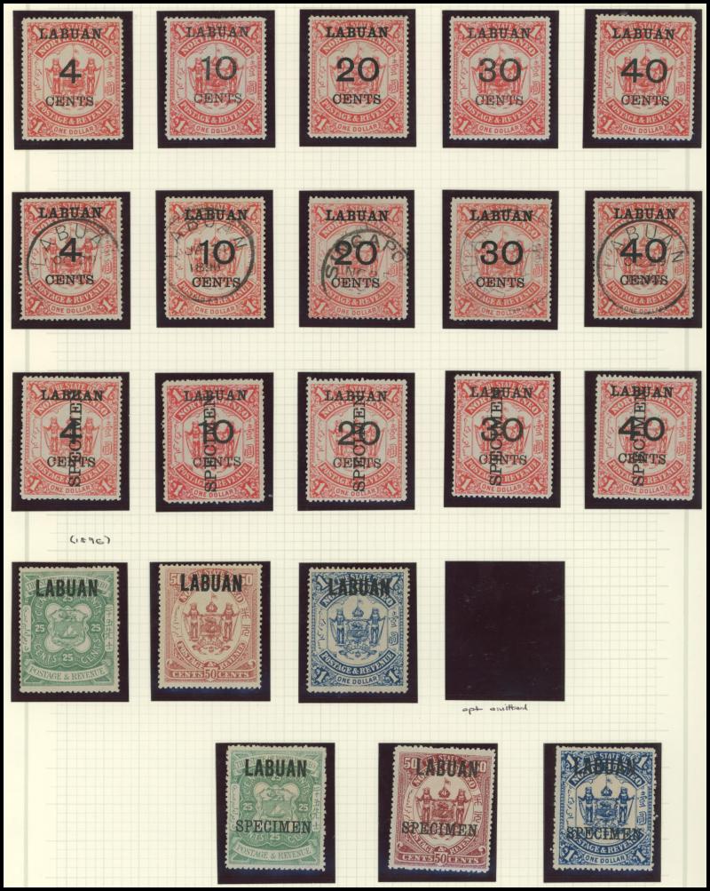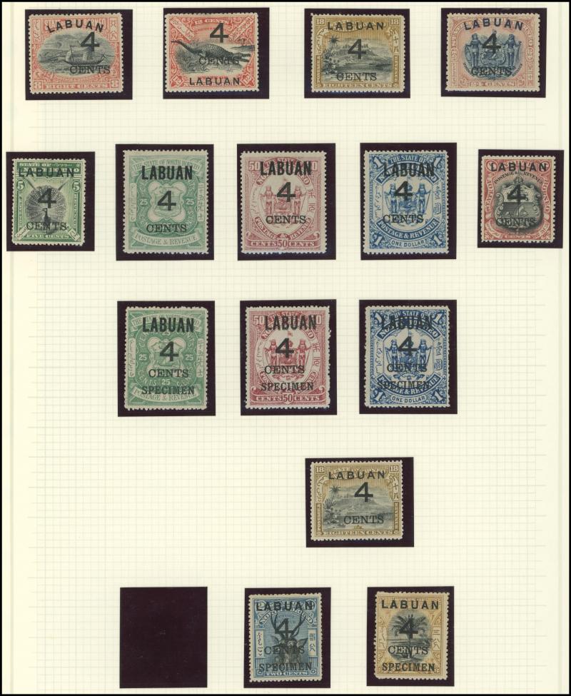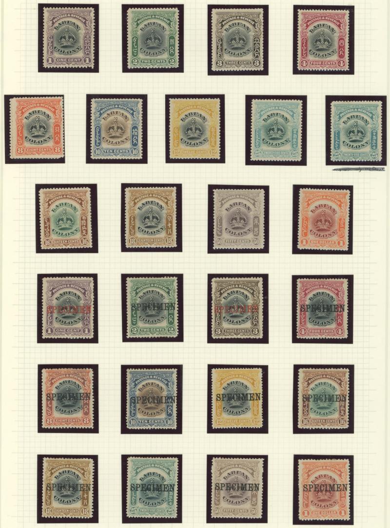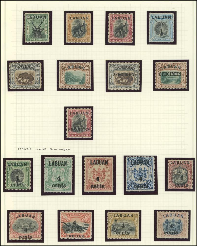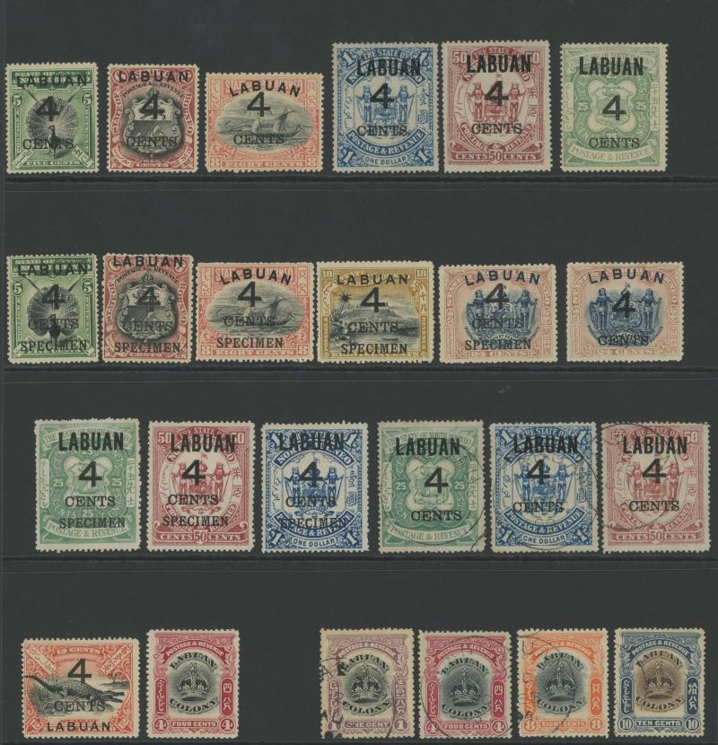 * (5c used) plus 12c 'LABUAN' at foot * & used x2, 1899 '4/CENTS' Surcharges set * & 'SPECIMEN' overprints (ex 12c) plus unissued 1c, 2c & 3c, 1900-02 Pictorials set *, 1902-03 Crown set * & 'SPECIMEN' overprints, 1904 '4/cents' Local Surcharges set