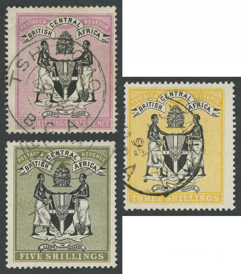 BRITISH CENTRAL AFRICA: 1895 Arms No Watermark 2/6d black & bright magenta, 3/- black & yellow and 5/- black & olive SG 26-28, the