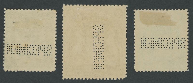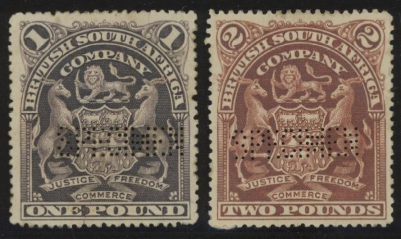 1898-1908 Monocolour Arms punctured 'SPECIMEN' £1 red-purple & £2 brown (both horizontally) and £5 blue & £10 lilac (both