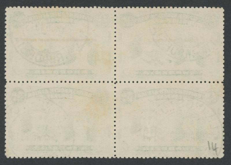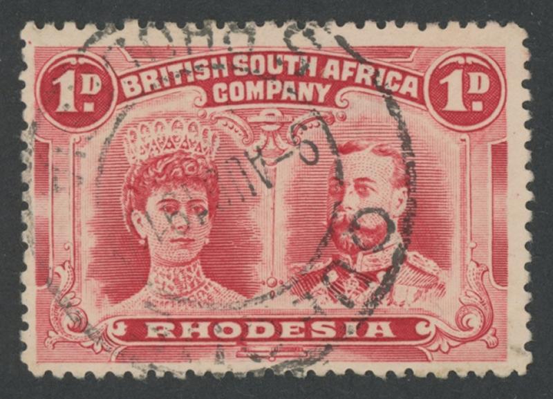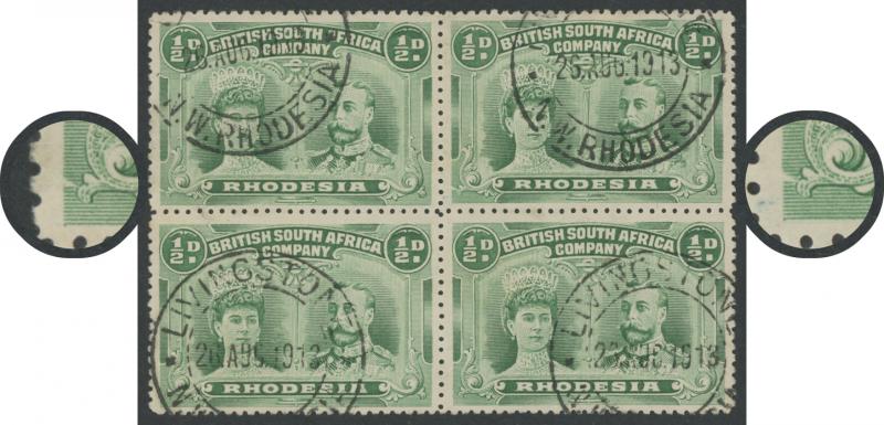 Frame [Pos 6-7], four neat light strikes of 'LIVINGSTONE/20.AUG.1913/ N.W.RHODESIA' double-ring cds well clear of the varieties. A scarce postally used multiple. (Image1) (Image2)