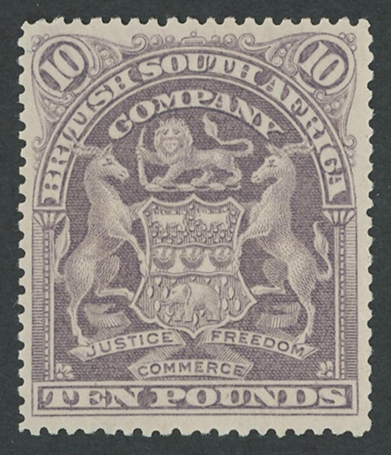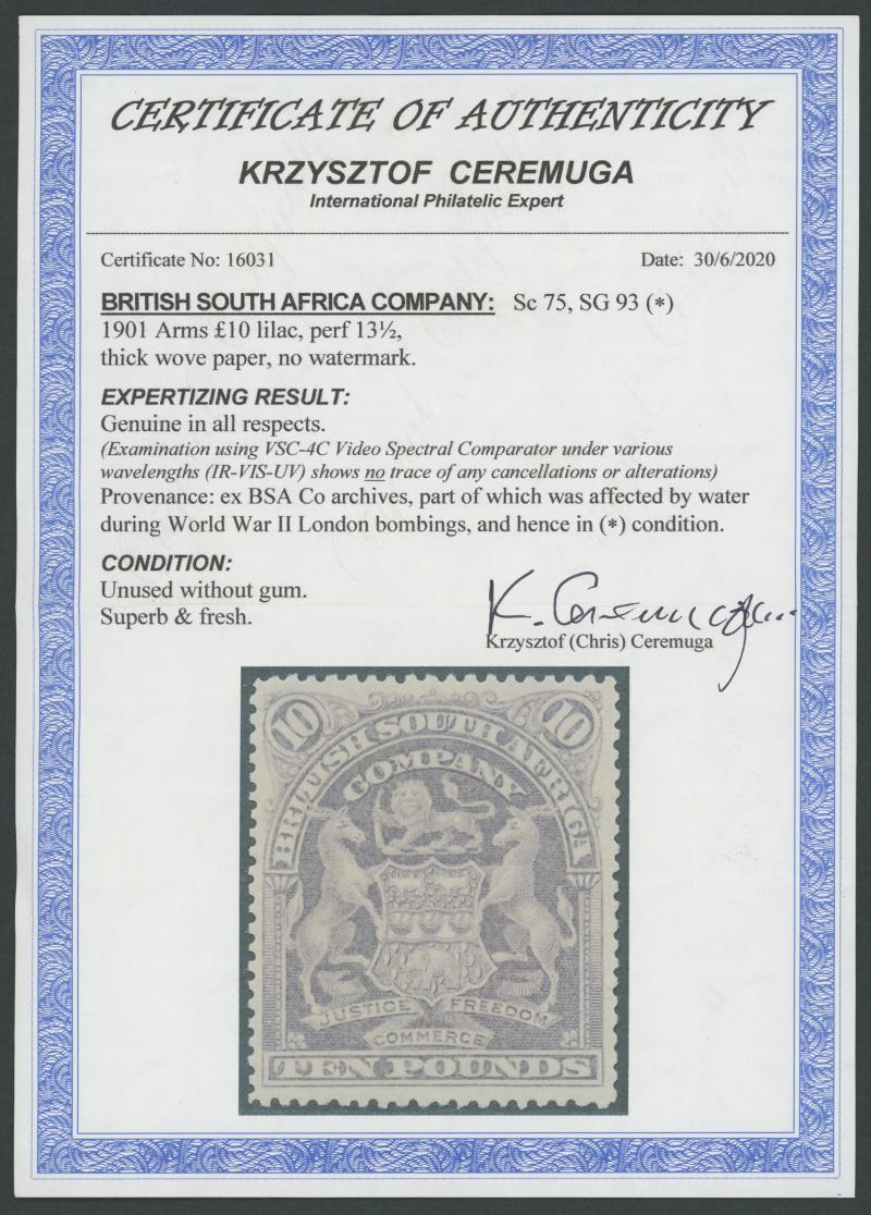 1898-1908 Monocolour Arms £10 lilac SG 93, unused, Cat £4000. Chris Ceremuga Certificate (2020) explains "ex BSA Co archives, part