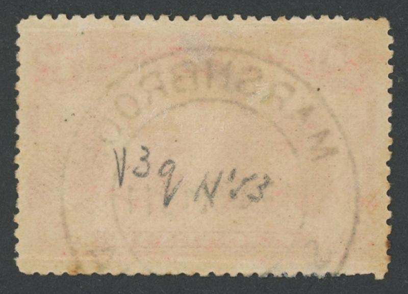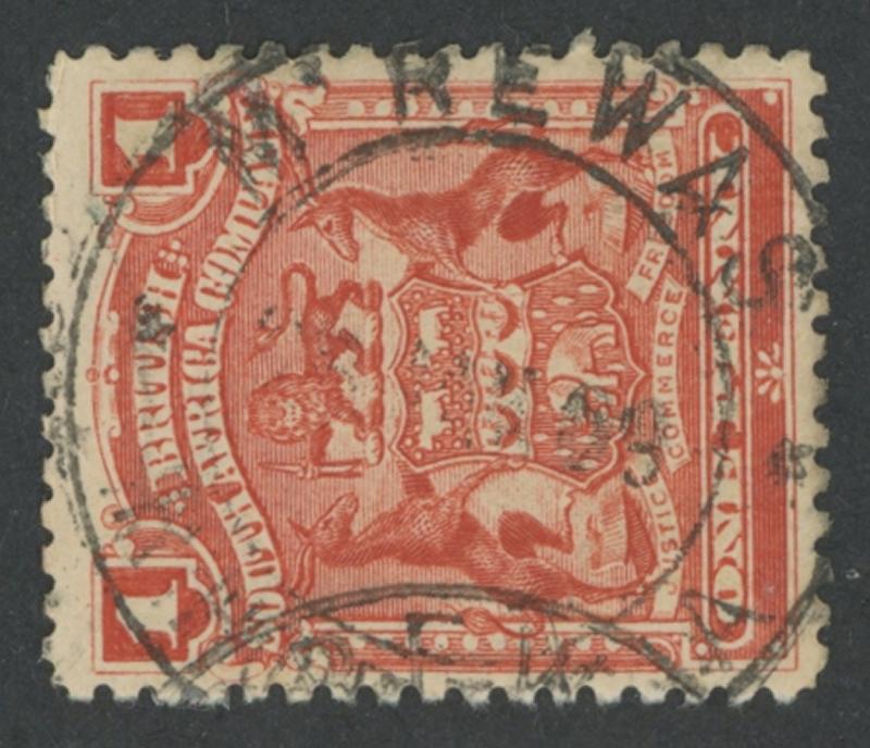 large-part strike (numerals almost complete) on 1892-94 Small Bi-Colour Arms 4d black & chestnut. PO 1888; closed 15.10.1893; re-opened by early 1894. The PO was moved from Dawson's Store on 15.10.1893 when this was abandoned due to the Matabele War;