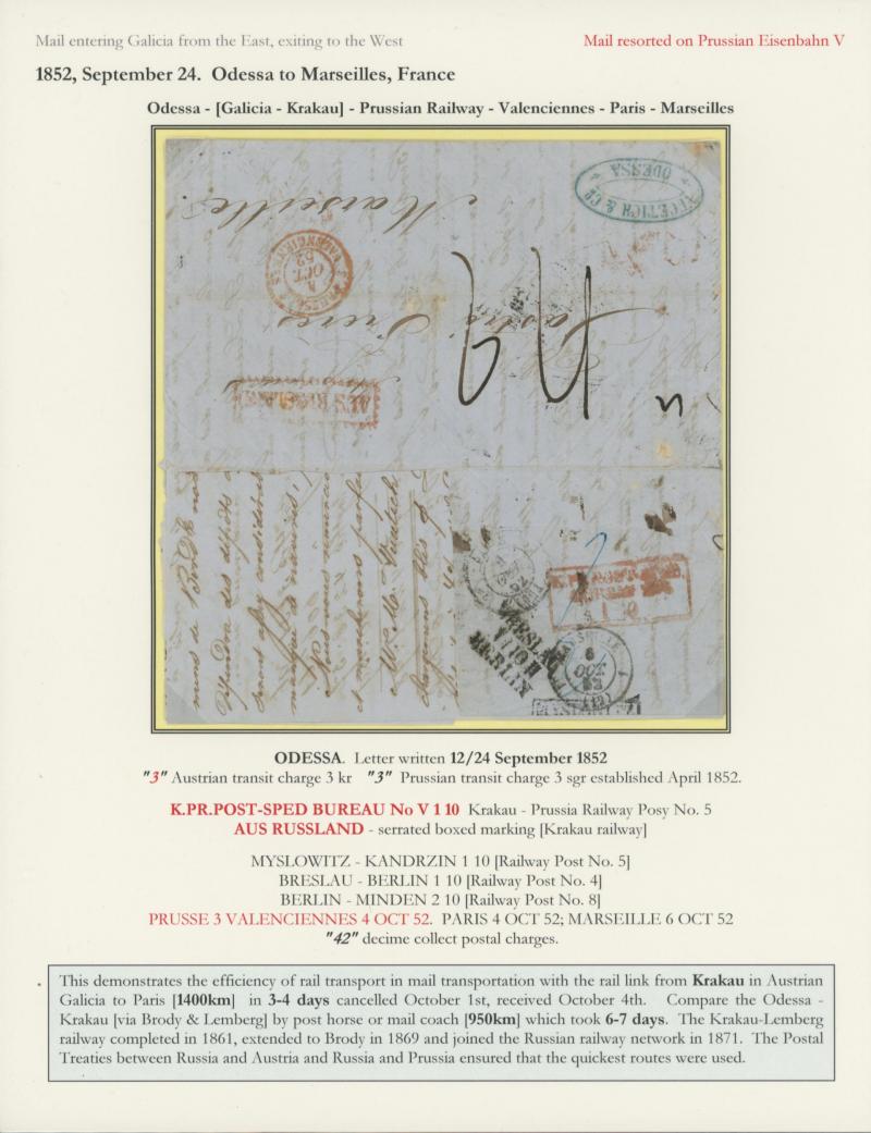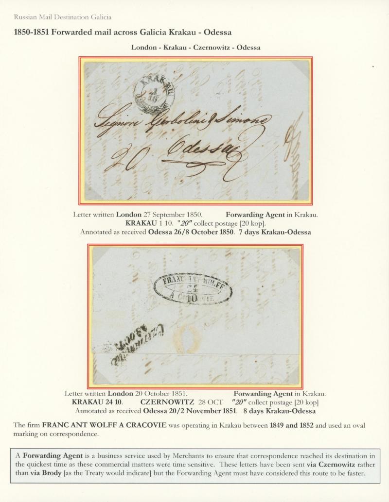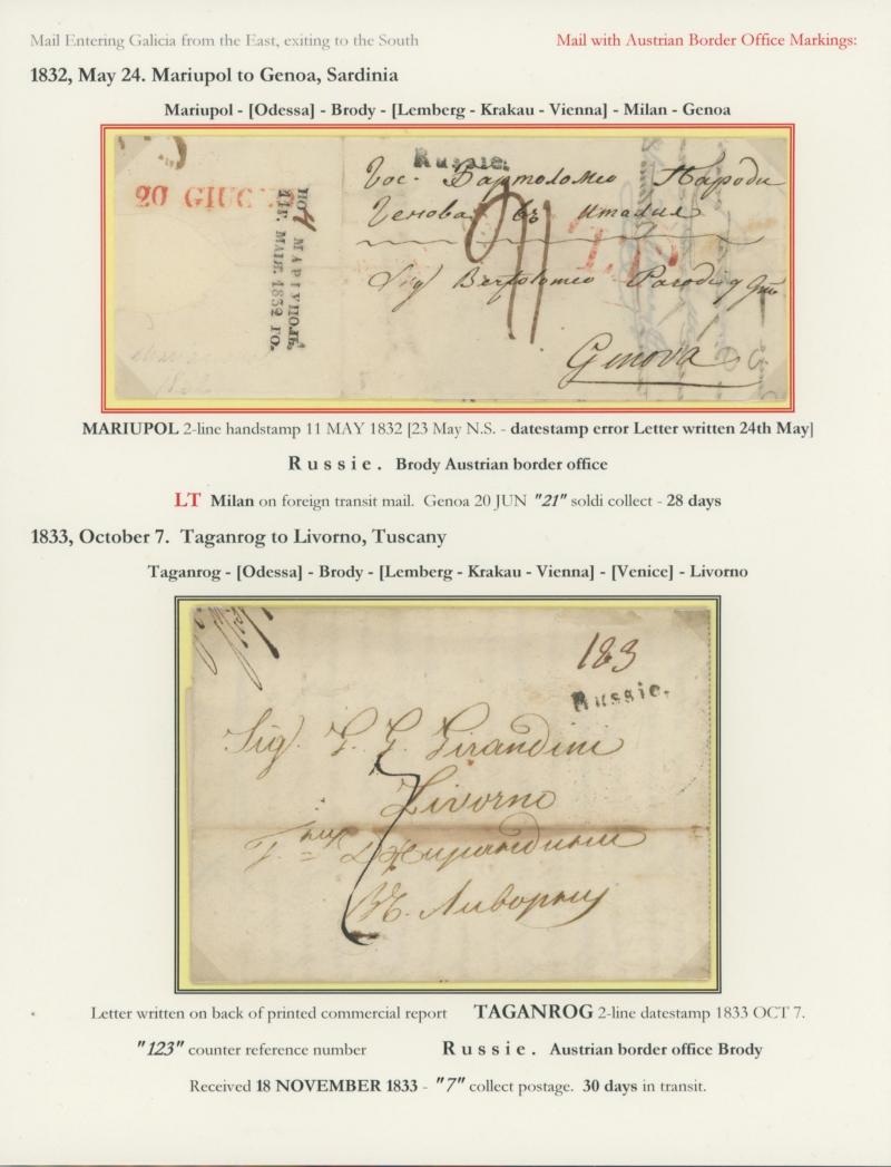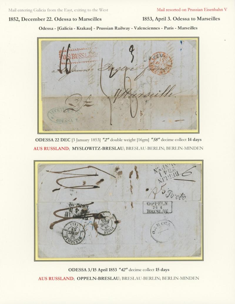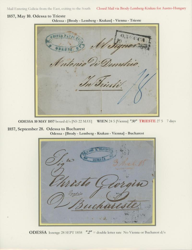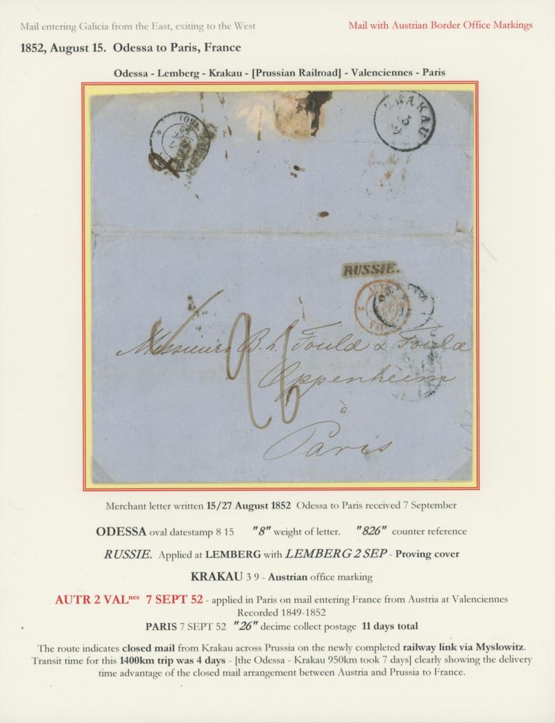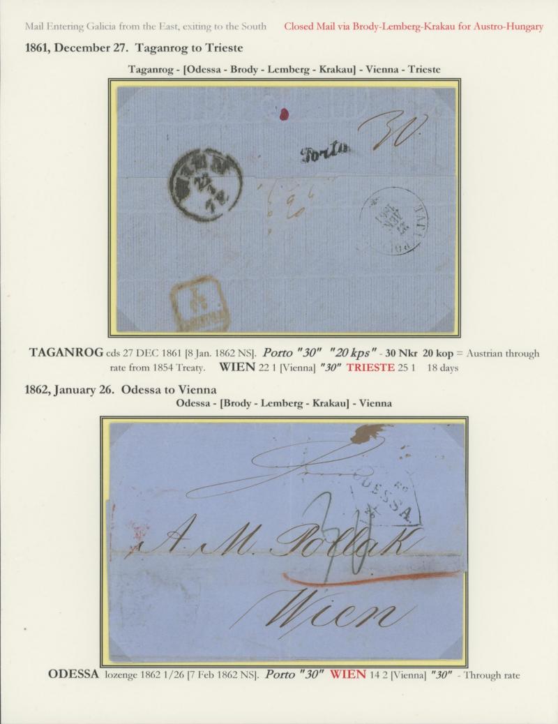 prestamp mail originating in Russia and carried by the four different trans-Galicia Routes to Western or Southern Europe, highlighting the often complex rate structures, the sometimes volatile political situation, the importance of border-exchange
