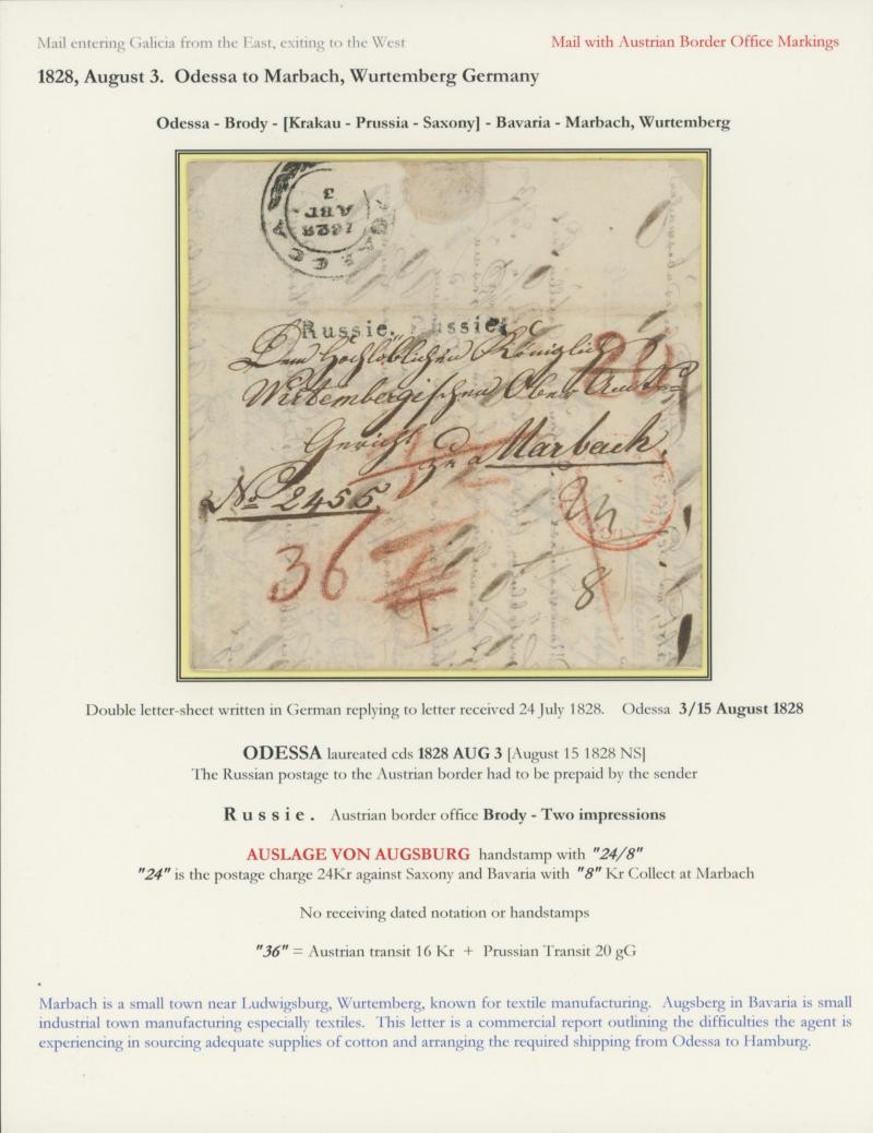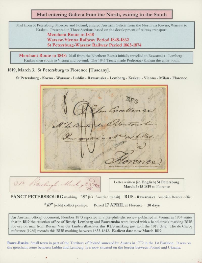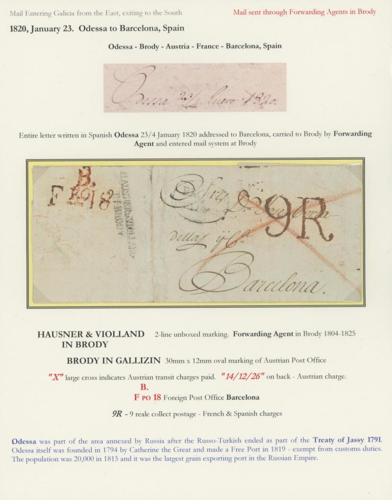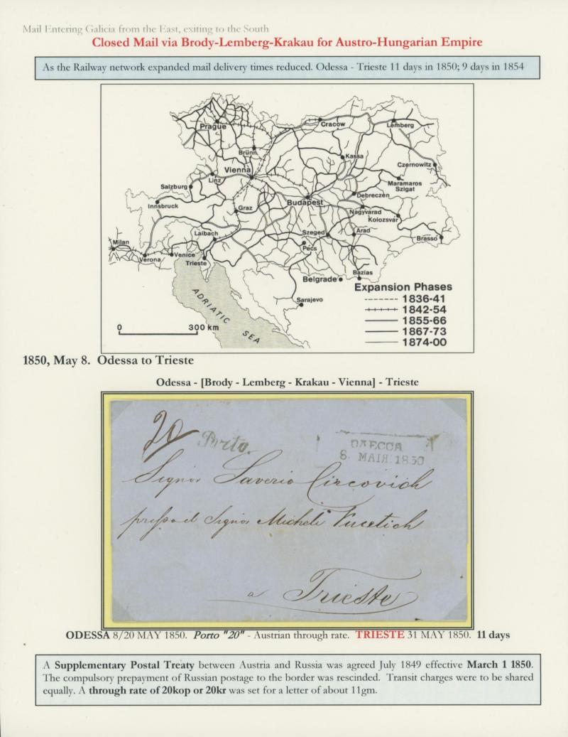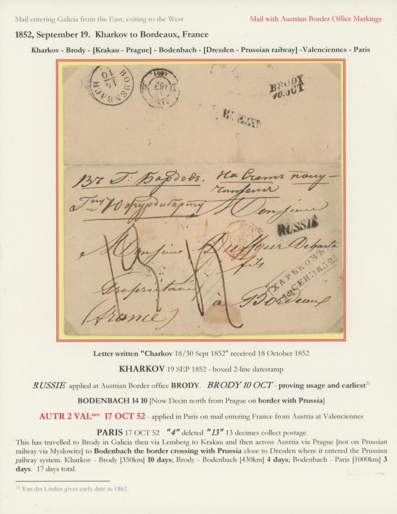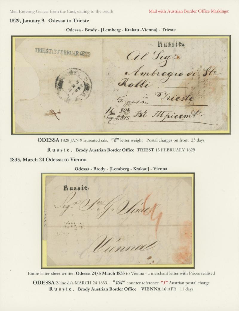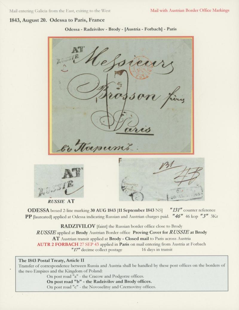 prestamp mail originating in Russia and carried by the four different trans-Galicia Routes to Western or Southern Europe, highlighting the often complex rate structures, the sometimes volatile political situation, the importance of border-exchange