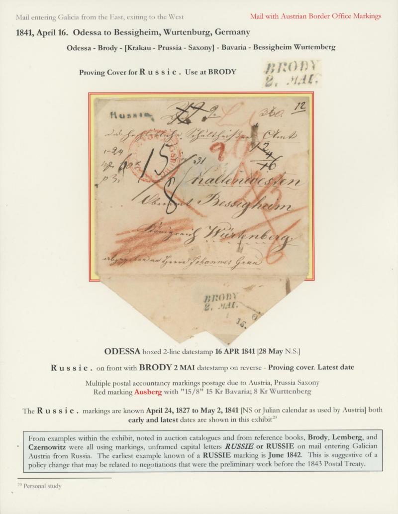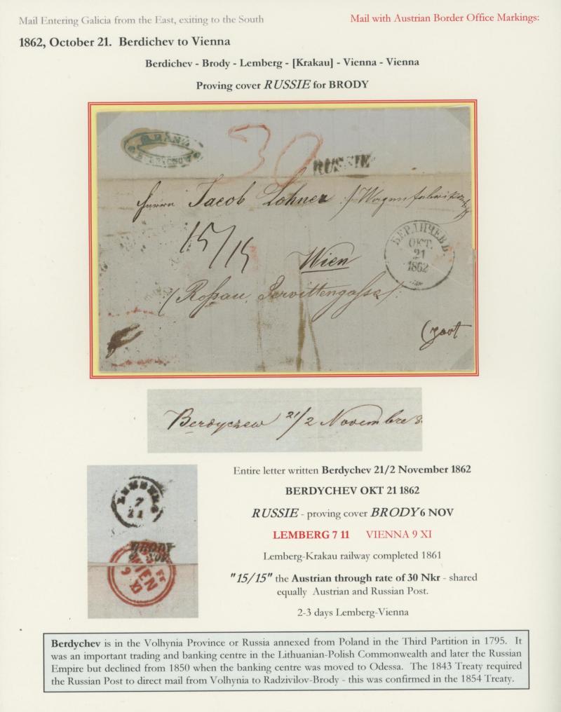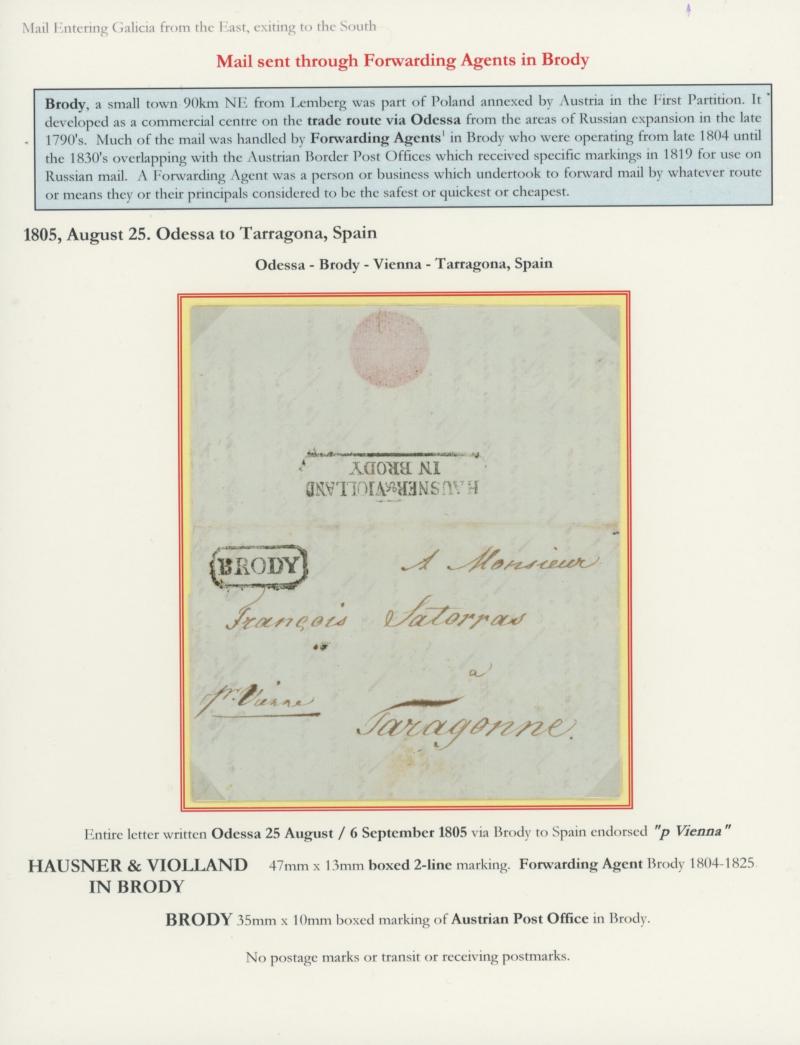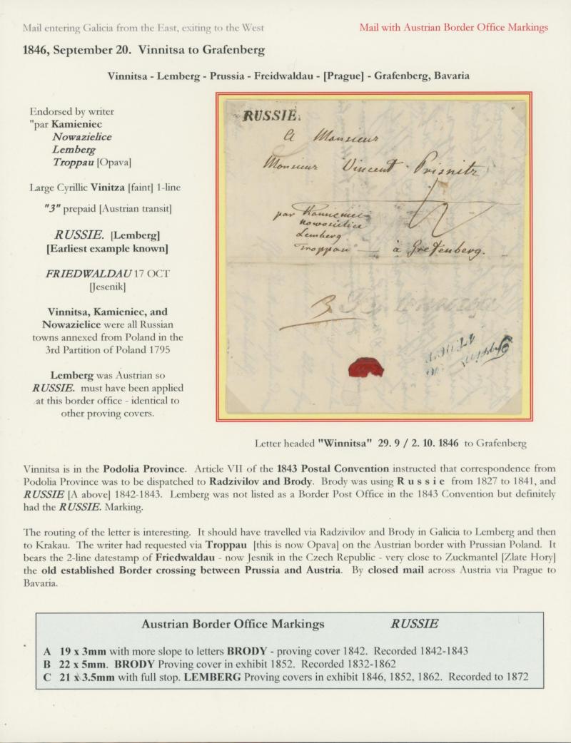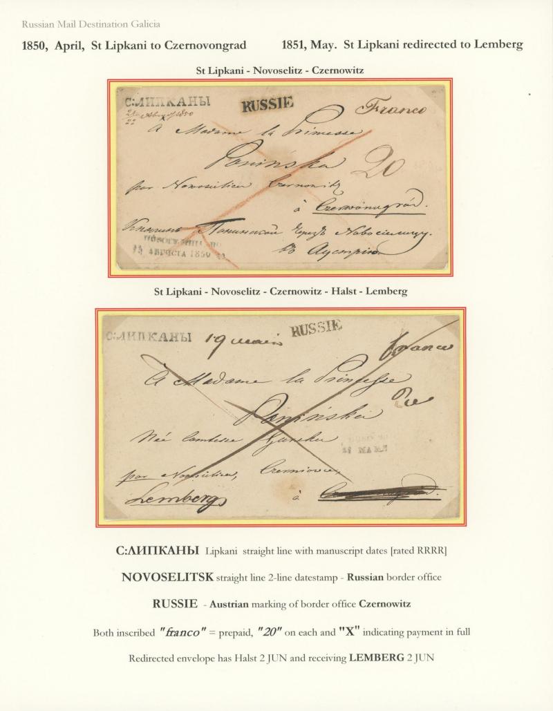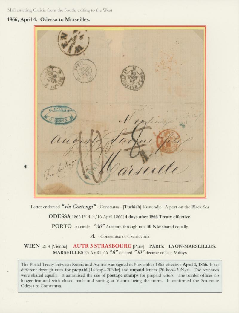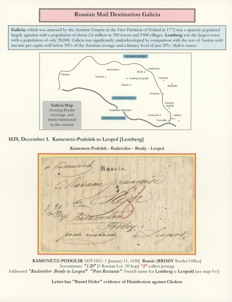 prestamp mail originating in Russia and carried by the four different trans-Galicia Routes to Western or Southern Europe, highlighting the often complex rate structures, the sometimes volatile political situation, the importance of border-exchange