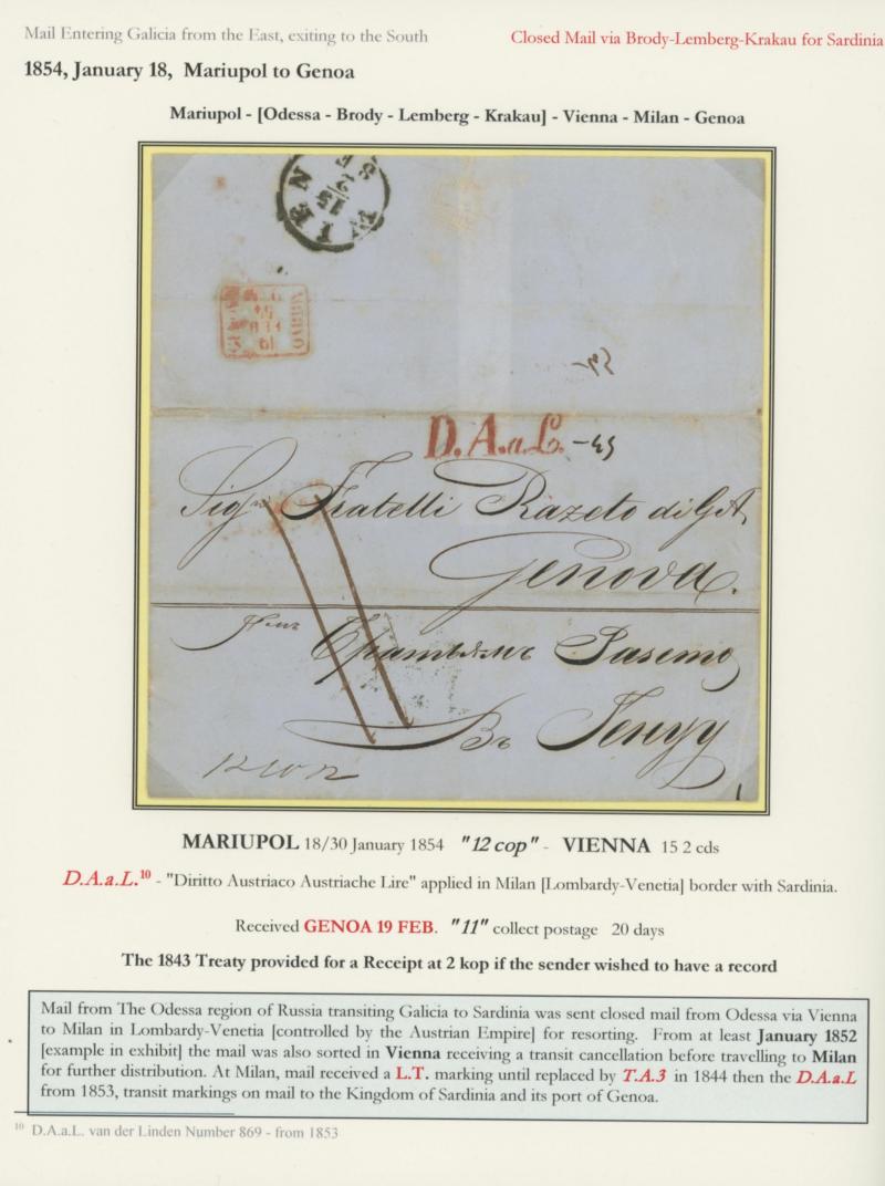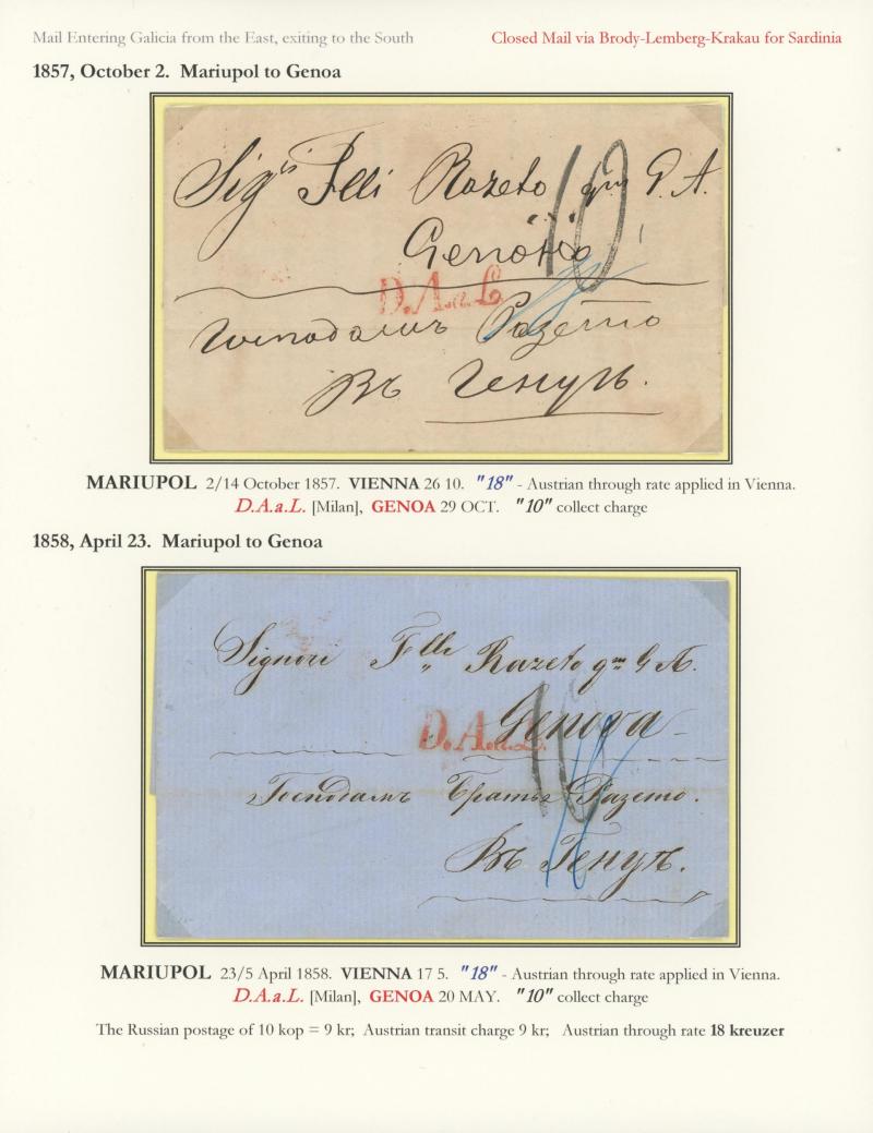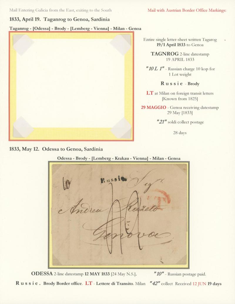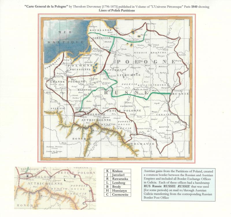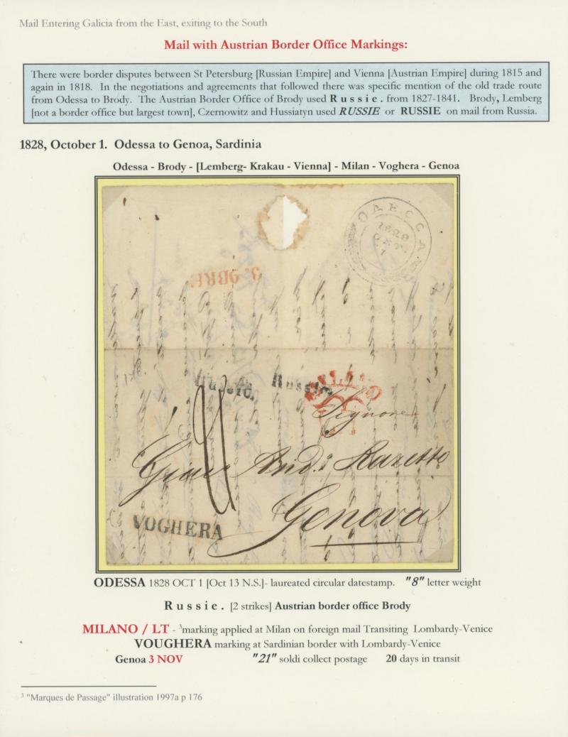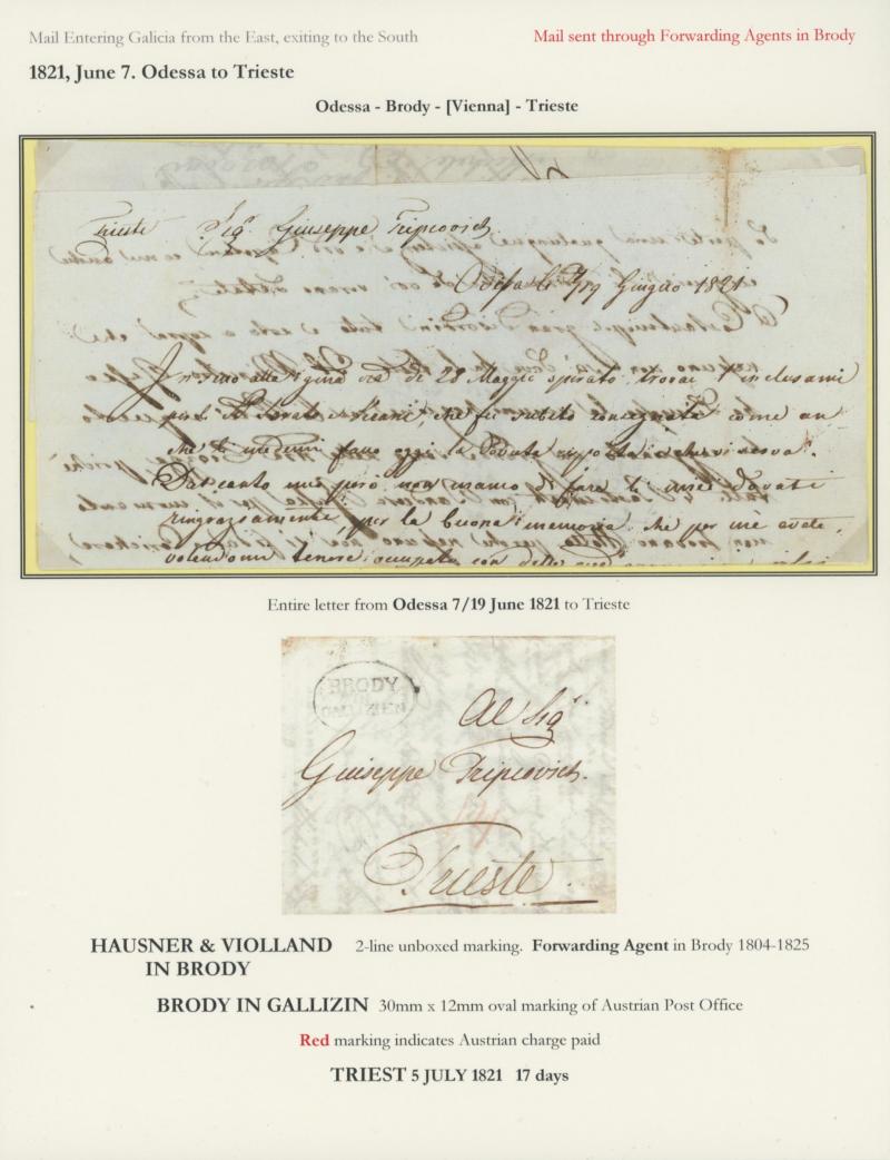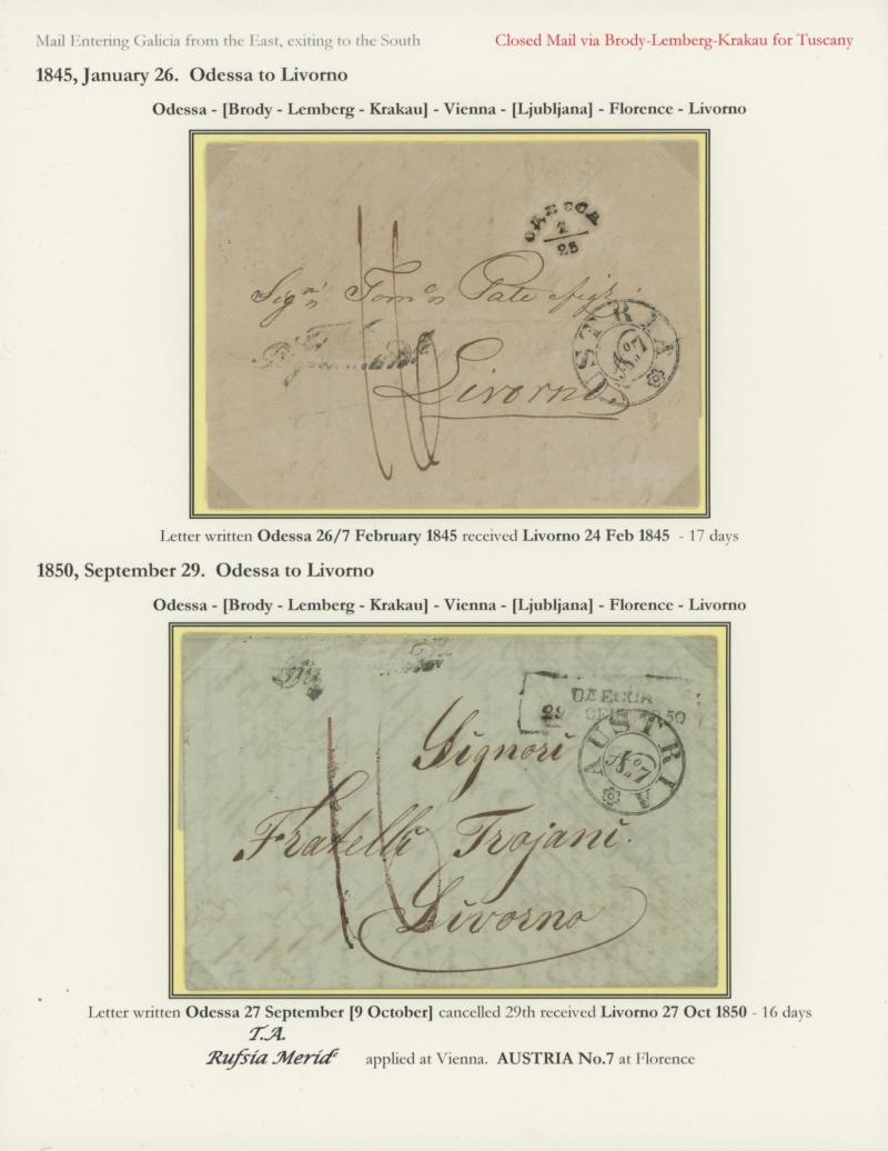 prestamp mail originating in Russia and carried by the four different trans-Galicia Routes to Western or Southern Europe, highlighting the often complex rate structures, the sometimes volatile political situation, the importance of border-exchange