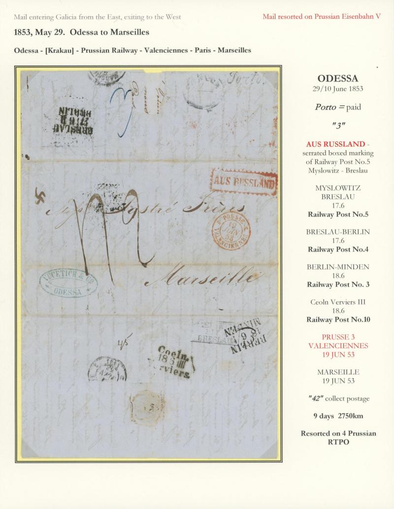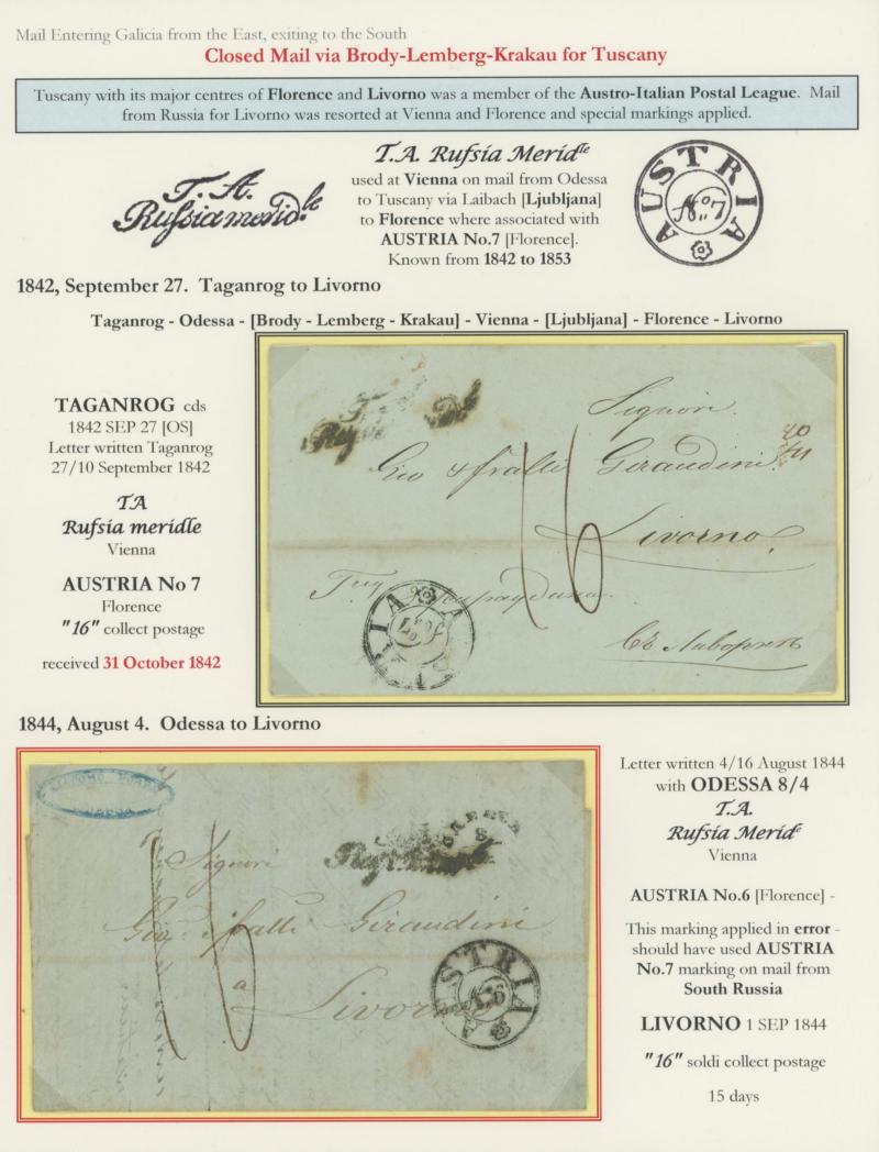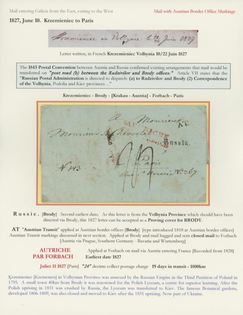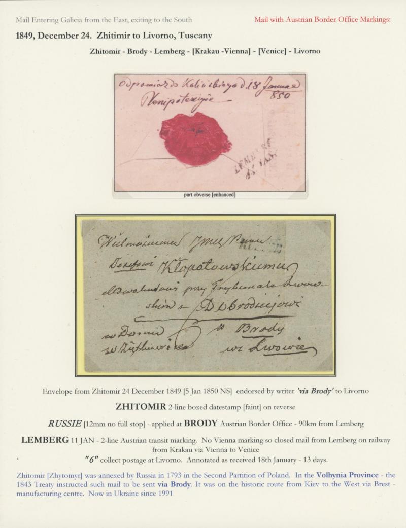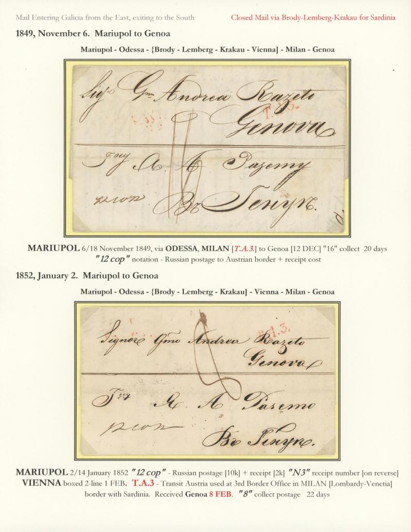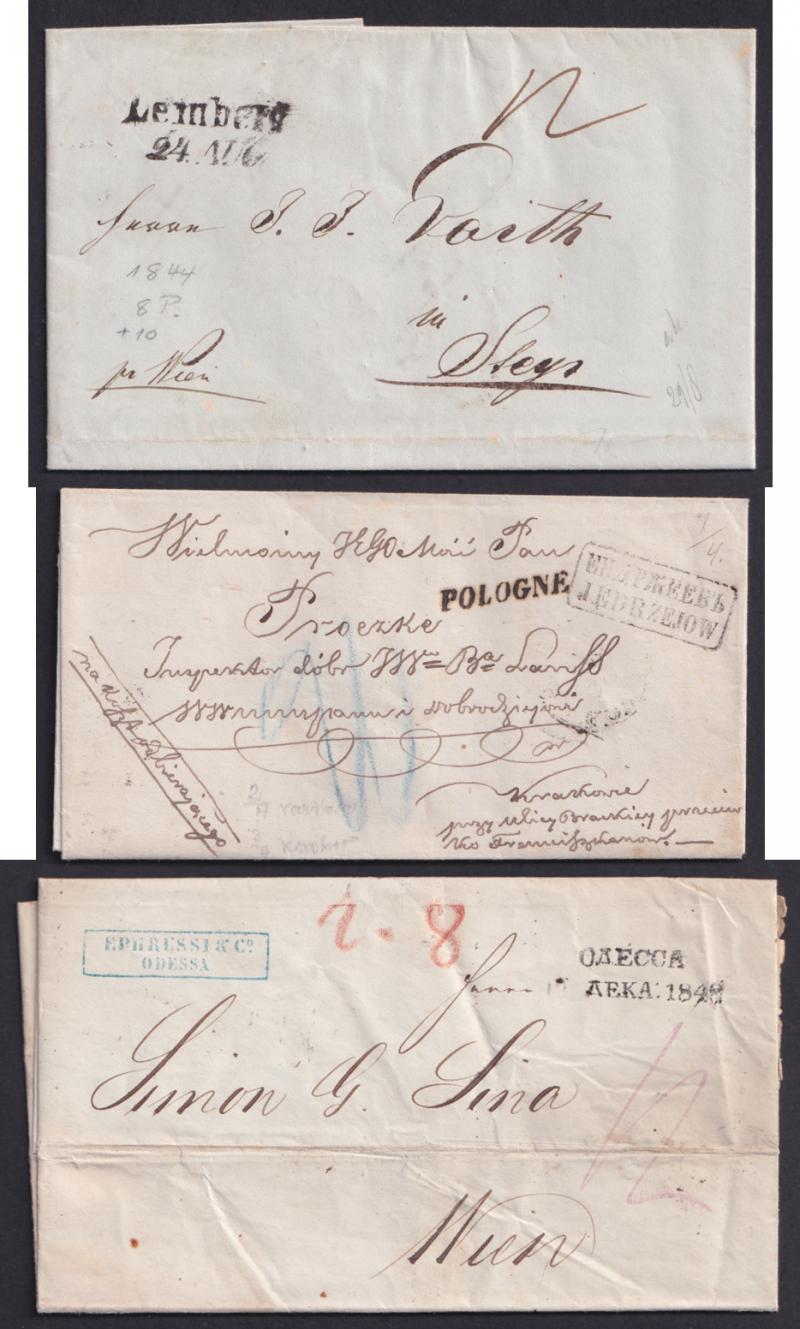 prestamp mail originating in Russia and carried by the four different trans-Galicia Routes to Western or Southern Europe, highlighting the often complex rate structures, the sometimes volatile political situation, the importance of border-exchange
