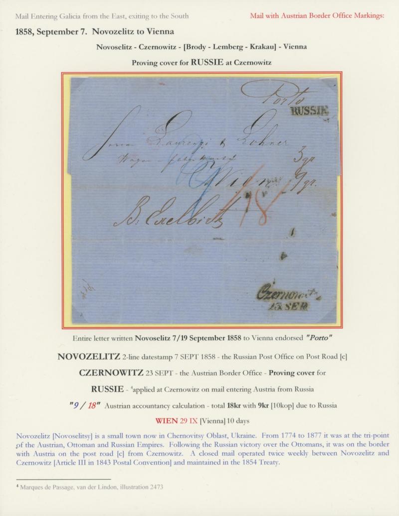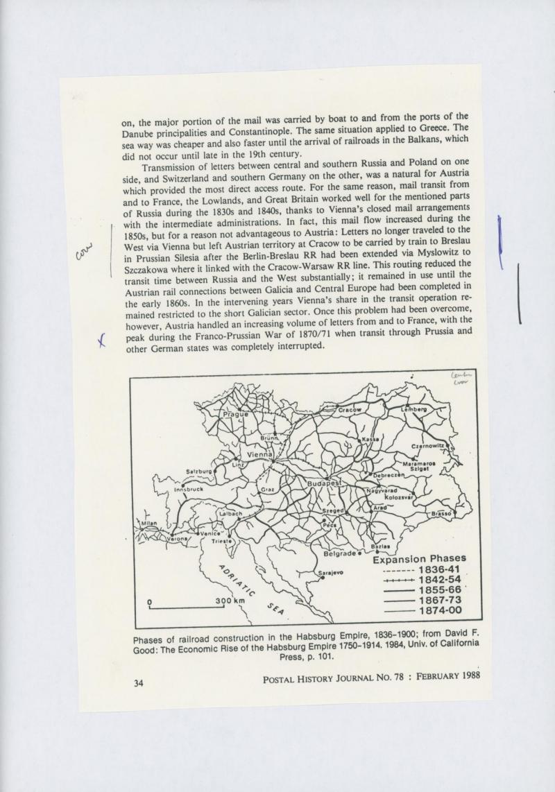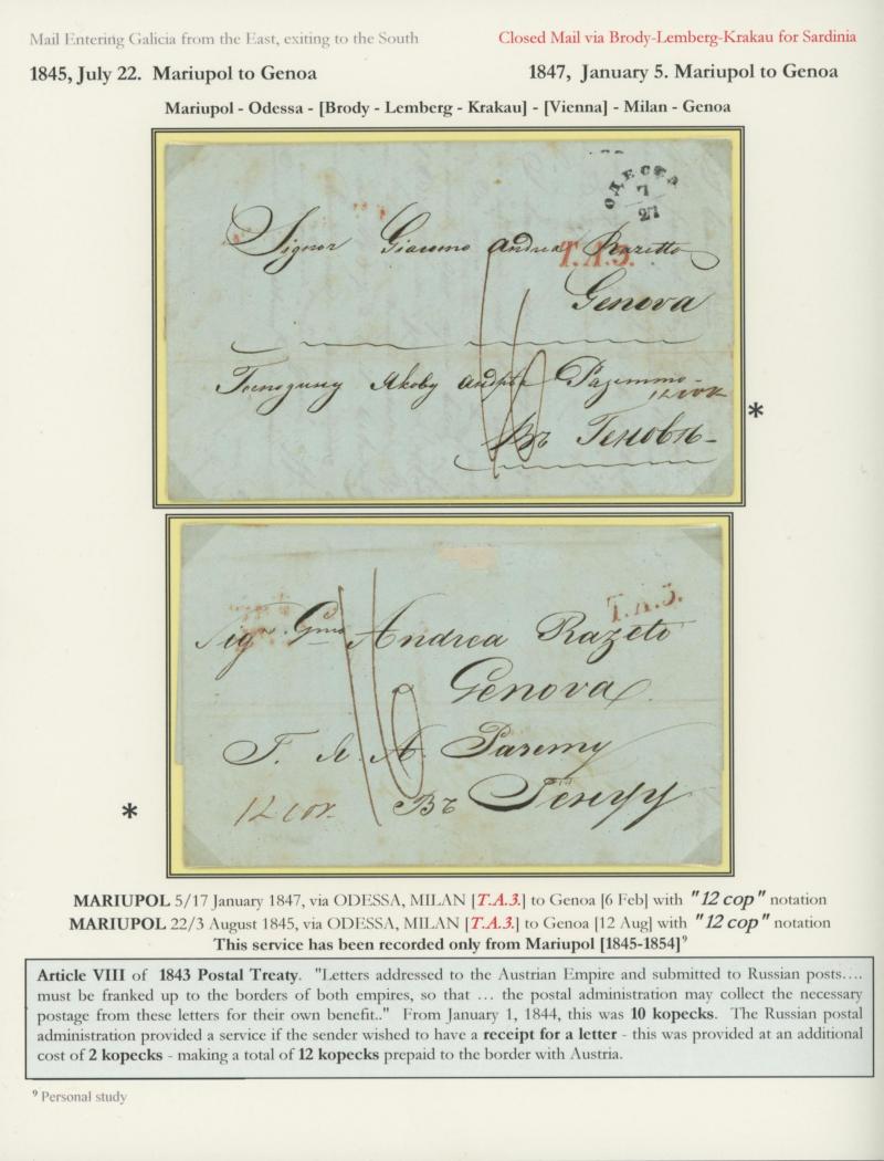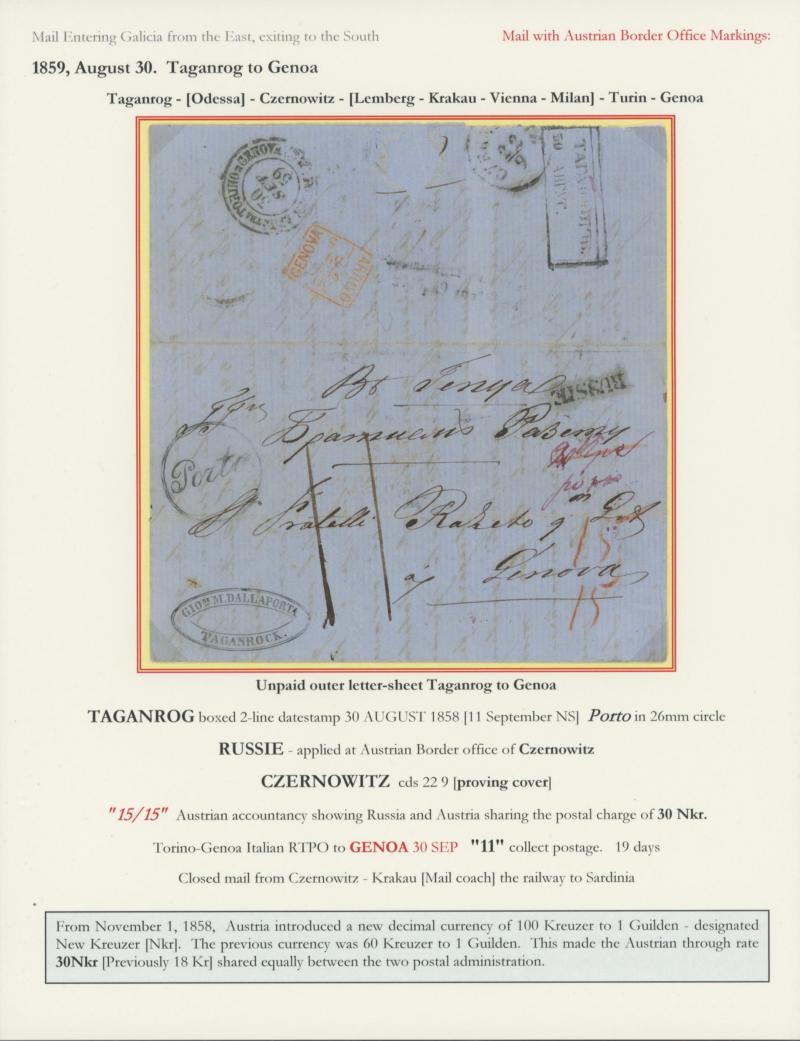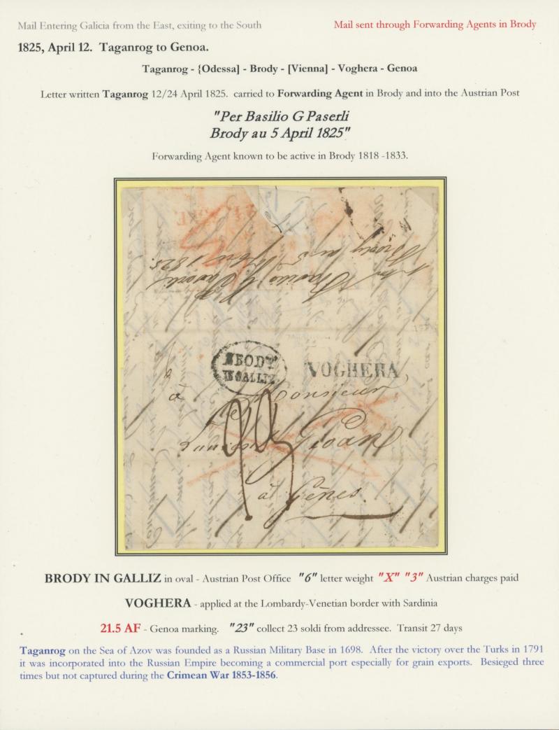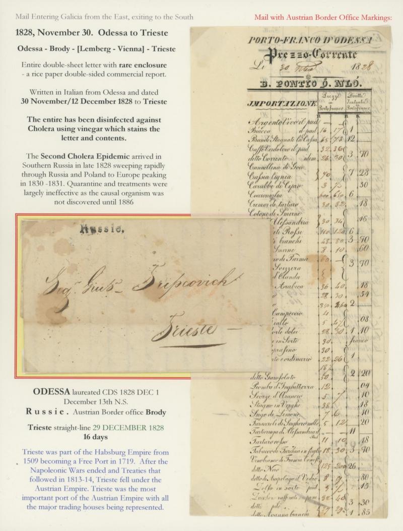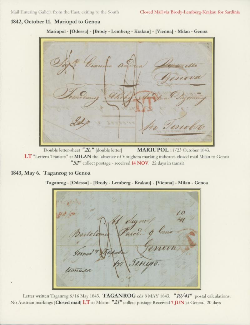 prestamp mail originating in Russia and carried by the four different trans-Galicia Routes to Western or Southern Europe, highlighting the often complex rate structures, the sometimes volatile political situation, the importance of border-exchange