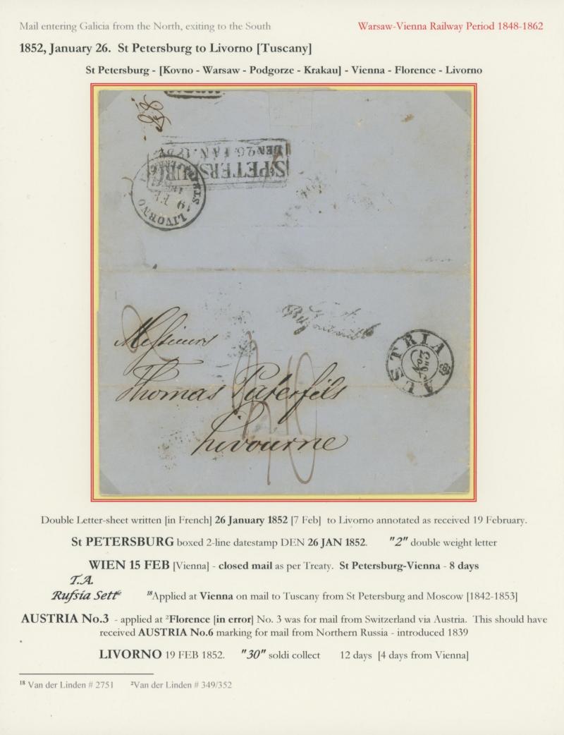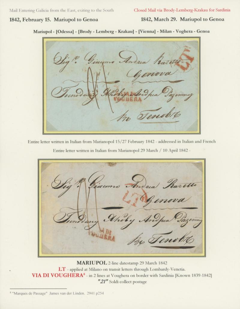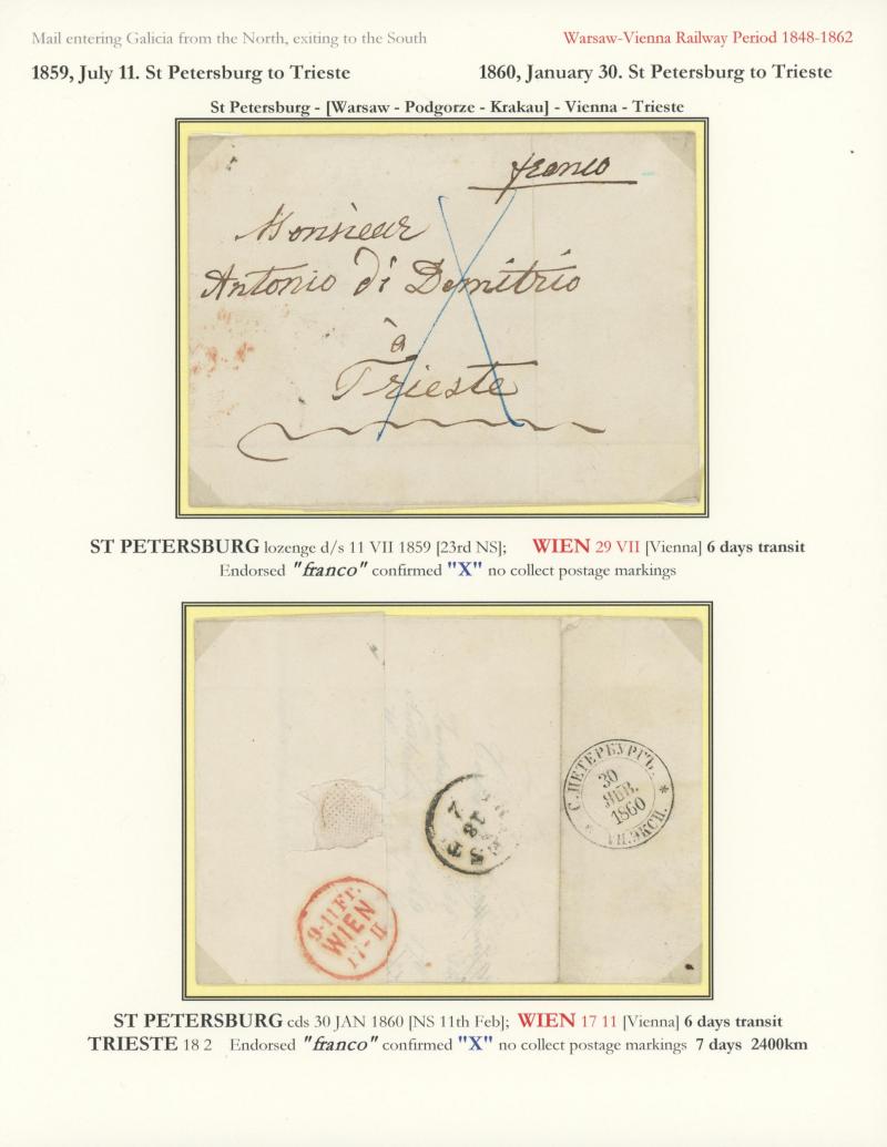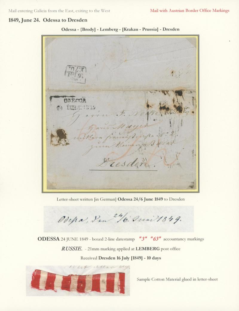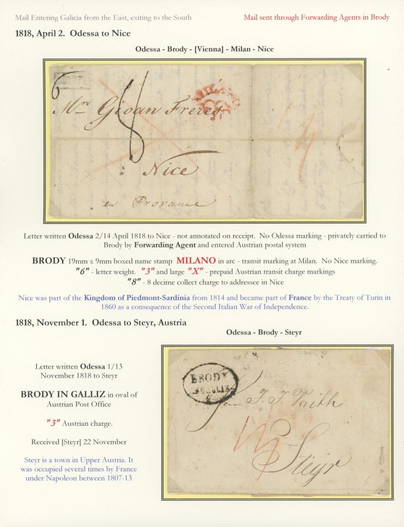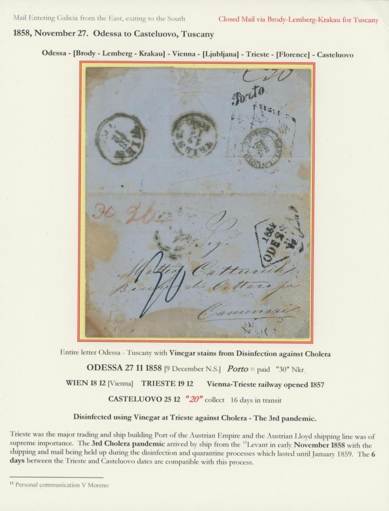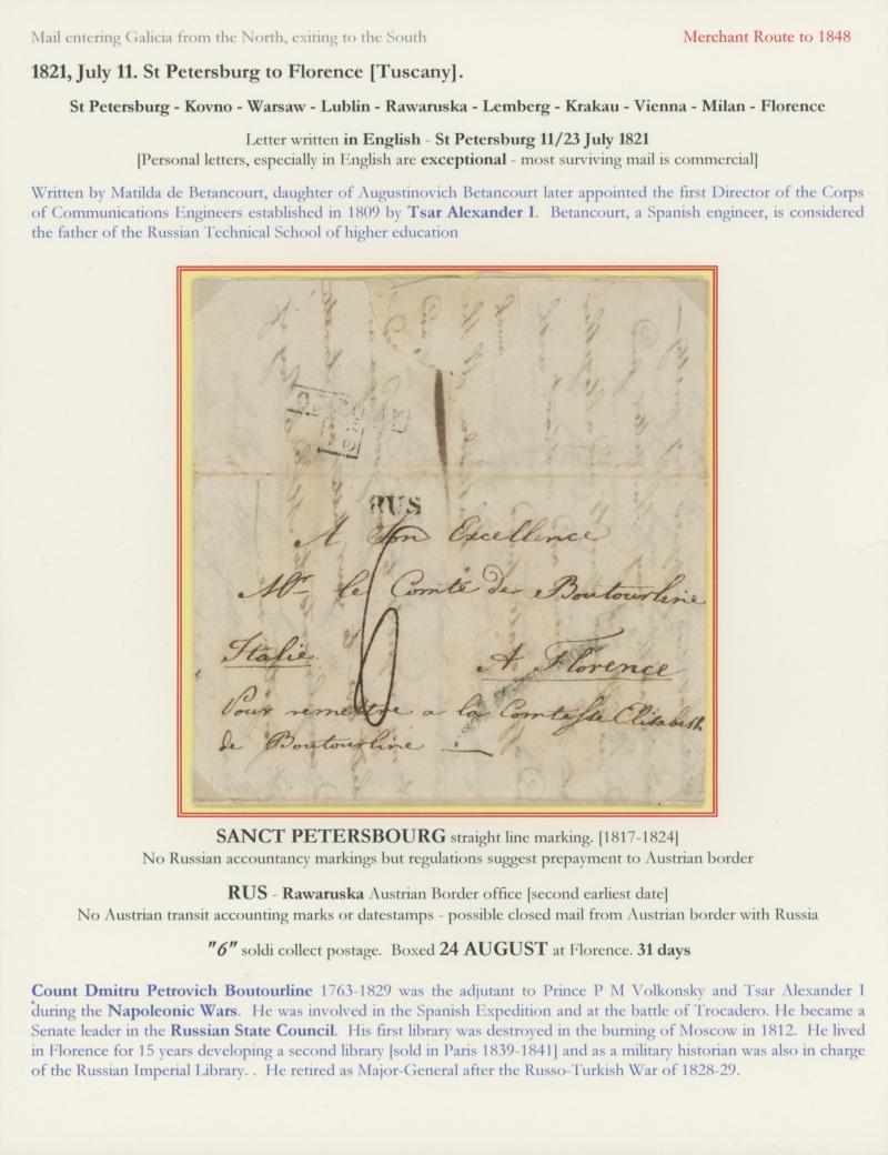 prestamp mail originating in Russia and carried by the four different trans-Galicia Routes to Western or Southern Europe, highlighting the often complex rate structures, the sometimes volatile political situation, the importance of border-exchange