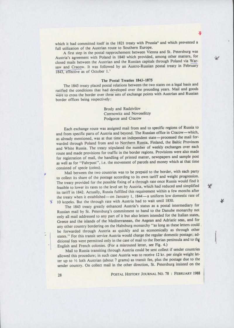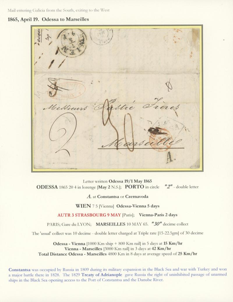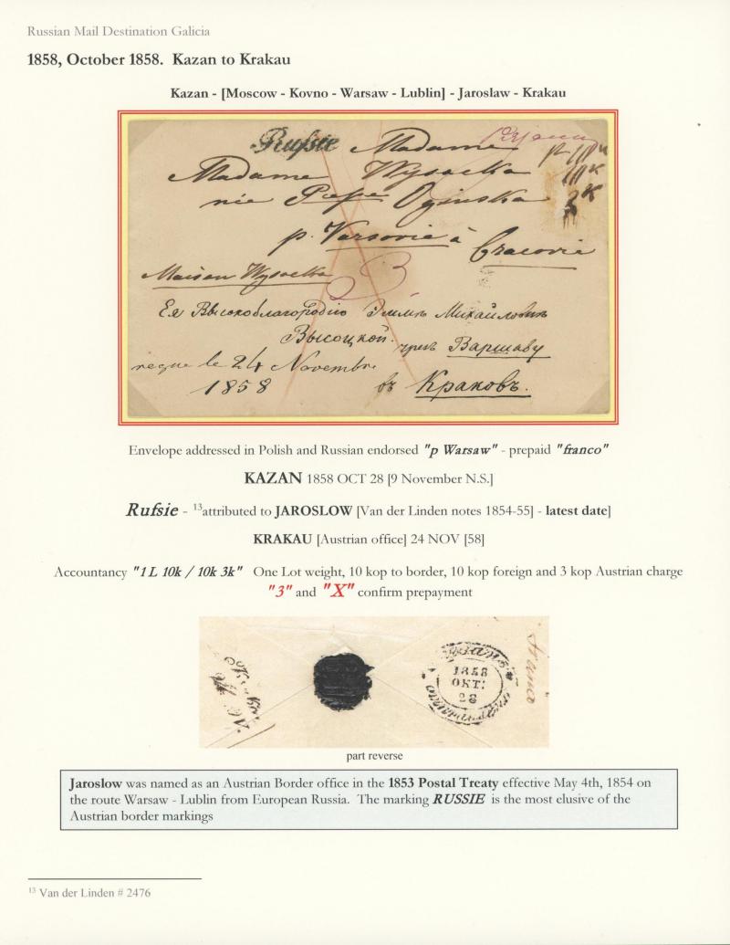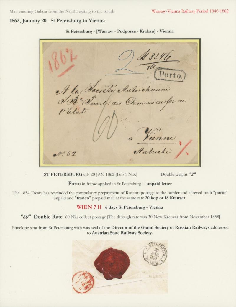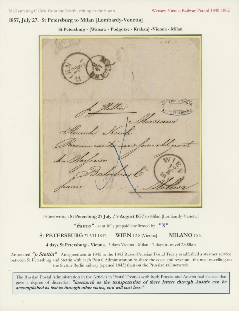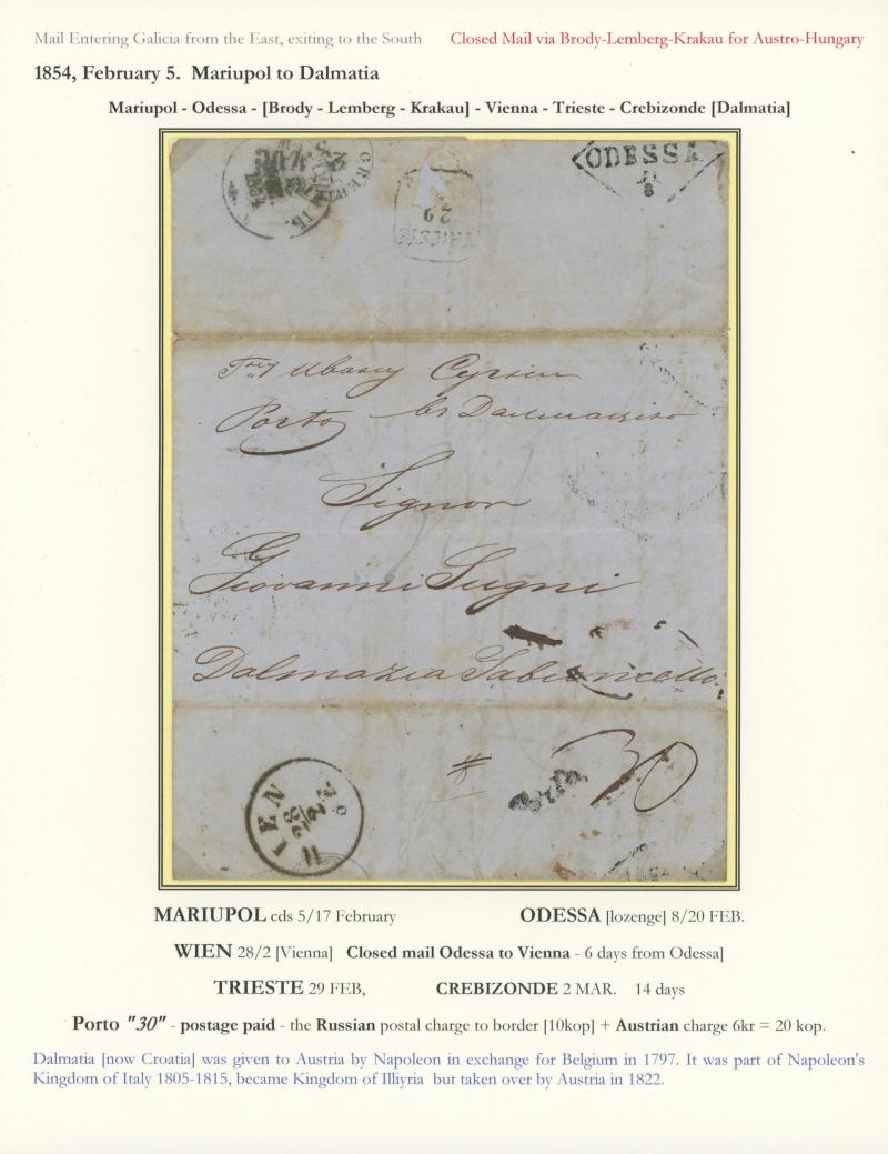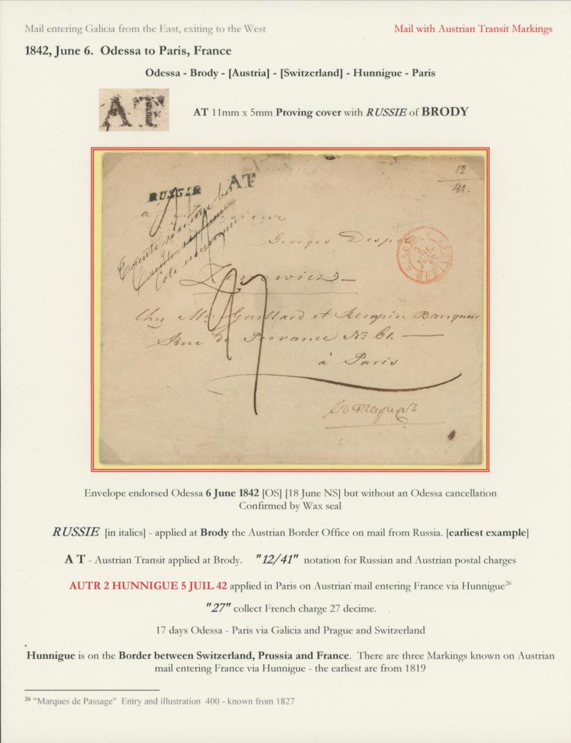 prestamp mail originating in Russia and carried by the four different trans-Galicia Routes to Western or Southern Europe, highlighting the often complex rate structures, the sometimes volatile political situation, the importance of border-exchange