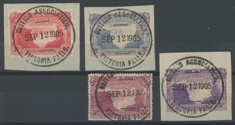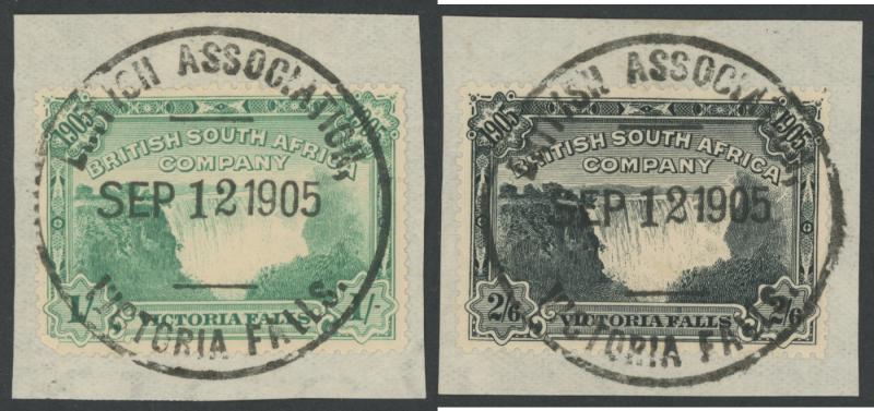Victoria Falls 1d to 5/- set all bar the 5d on small pieces with complete strikes, Cat £325. The British Association arrived on Sunday 12 September at 5am, Professor George Darwin (son of Charles Darwin) opening the Victoria Falls Railway Bridge at