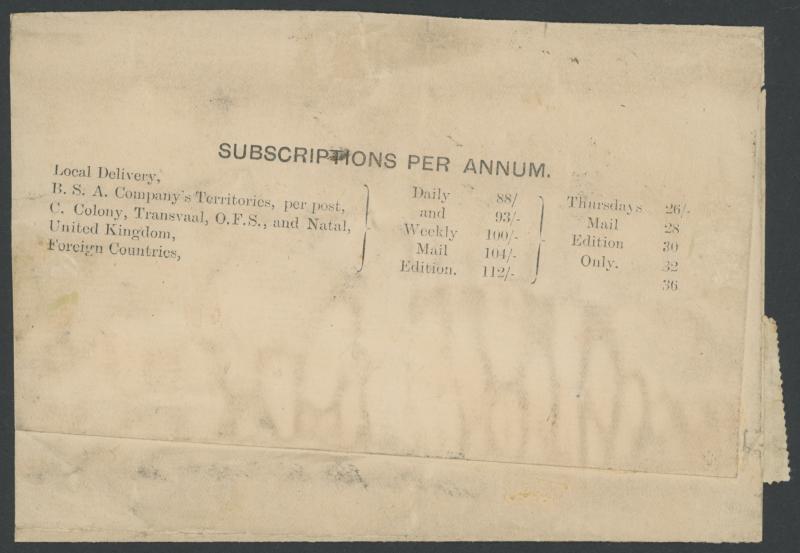 1902 (Nov 12) The Bulawayo Chronicle newspaper wrapper with annual subscription prices printed on reverse, to London with BSAC Arms