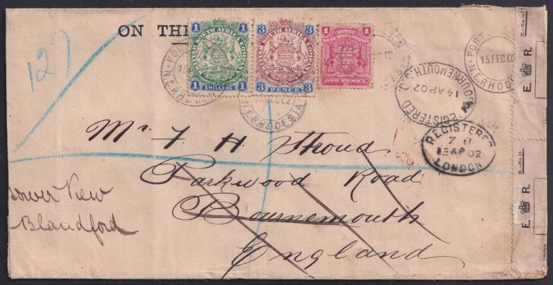 Small Arms 1d rose and Large Arms Die I 3d brown & blue and 1/- green & blue tied by largely fine Nothern Rhodesia 'FORT JAMESON' cds, superb Nyasaland 'CHINDE/F/MR 6/02/B.C.A' transit backstamp, London & Bournemouth 'REGISTERED' transits on the face