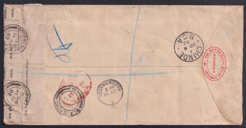 where repaired with a pair of 'FOUND OPEN AND/OFFICIALLY SEALED' labels plus margin, then re-directed and 'BLANDFORD/AP 14/02' arrival on the reverse, minor edge marks. Although Rhodesia joined the UPU on 1.3.1901, the overseas letter rate remained