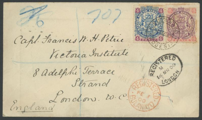 1900 (Feb 1) registered to England with BSAC Large Arms Die I 4d blue & mauve and Redrawn 6d purple & pink tied by Bulawayo cds