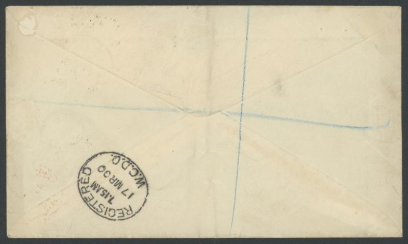 with very fine 'REGISTERED/BULAWAYO' cds in red below, London 'REGISTERED/16 MR 00' oval arrival on the face and '.../17 MR 00/W.C.D.O.' delivery backstamp, a few slightly aged perfs & minor blemishes. The rate was 6d per ½oz Great Britain letter