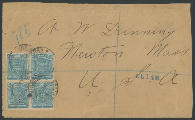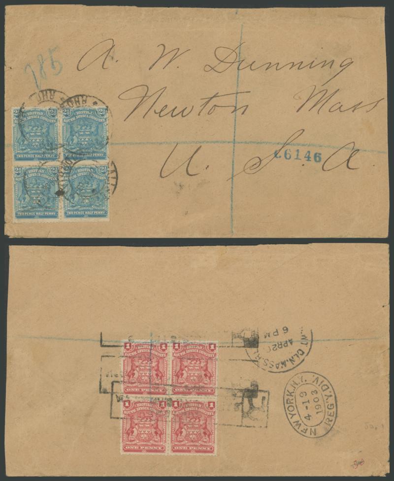 SALISBURY/S.RHODESIA' boxed handstamp (unlisted by Proud) on the reverse, New York '4-19/1903' oval transit and 'NEWT CEN.MASS' next-day arrival backstamps, slightly trimmed at right & minor edge faults. The rate was quadruple 2½d UPU foreign letter