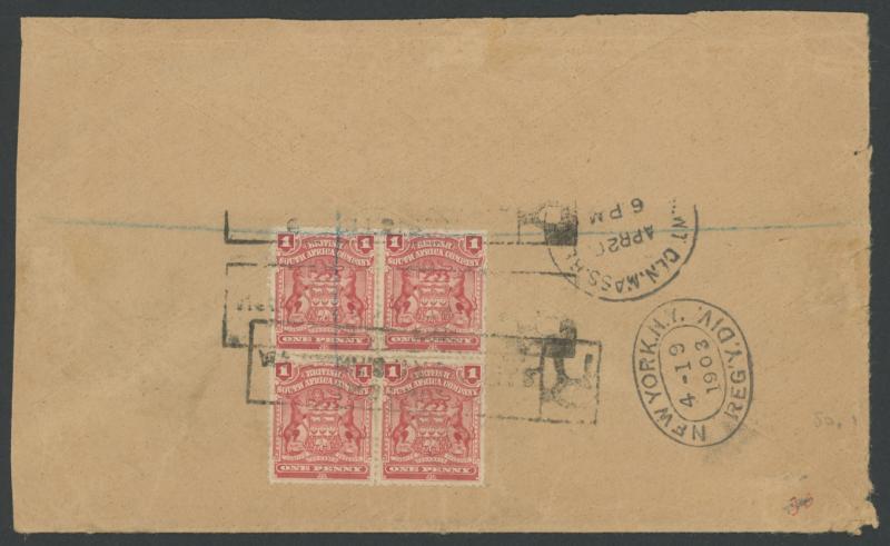 1903 (March 16) registered to USA with Arms 2½d blue block of 4 tied by Salisbury cds on the face and 1d rose block of 4 tied by 'R