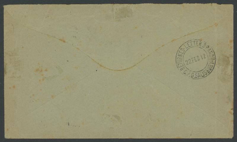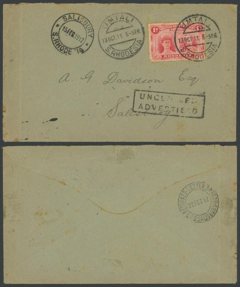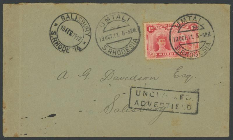 envelope with Double Heads 1d rose tied by 'UMTALI/13.OCT.1911/ S.RHODESIA' double-ring cds, undeliverable with Salisbury '15.FEB.1912' cds and largely very fine 'UNCLAIMED/ADVERTISED' boxed handstamp on the face, some aging marks. Handbook Very
