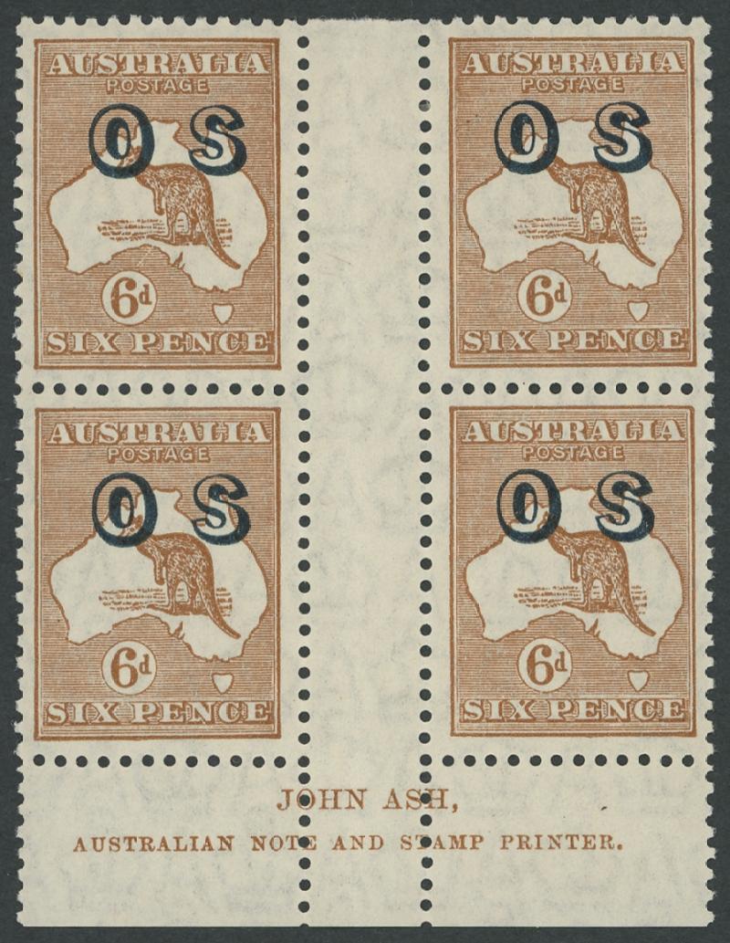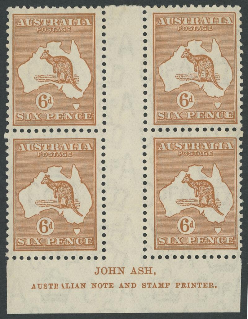6d chestnut SG 132 Plate 4 John Ash Imprint block of 4 ACSC 23(4)z, the upper units very lightly mounted, the lower units