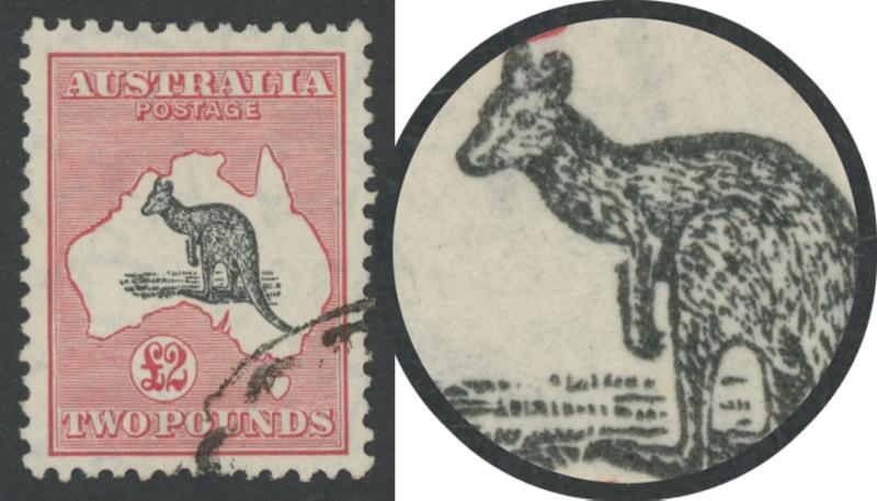 £2 grey-black and rose-crimson SG 138 with White Flaw at Top of Kangaroo's Arm [Pos L41] ACSC 58(V)m, small-part cds cancel, Cat