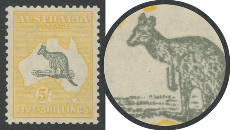 5/- grey and yellow-orange SG 135 with Notch in Kangaroo's Snout [Pos L23] ACSC 46(V)i, lightly mounted, Cat $950. (Image1) (Image2)