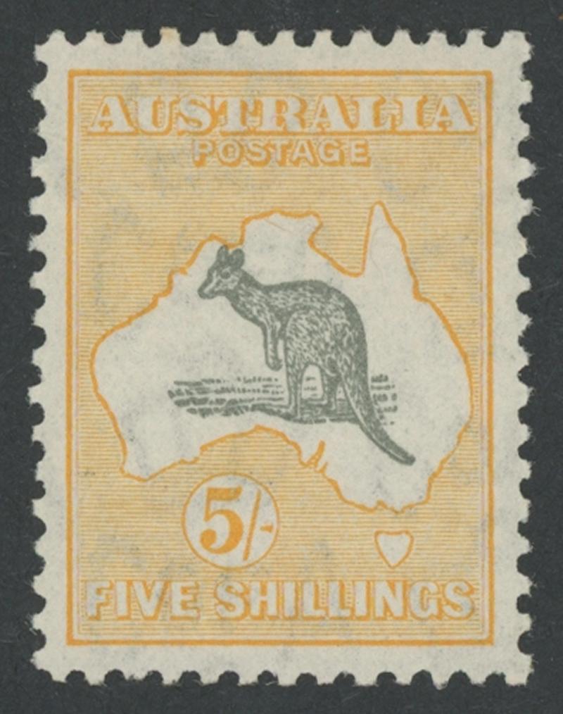 5/- grey and yellow-orange SG 111 with Break at Top of Kangaroo's Arm [Pos L41] ACSC 45(V)m, well-centred, lightly mounted, Cat