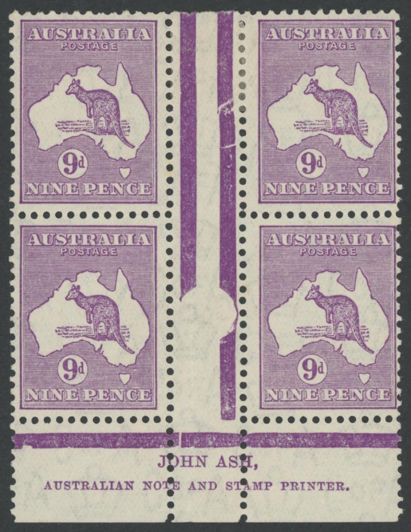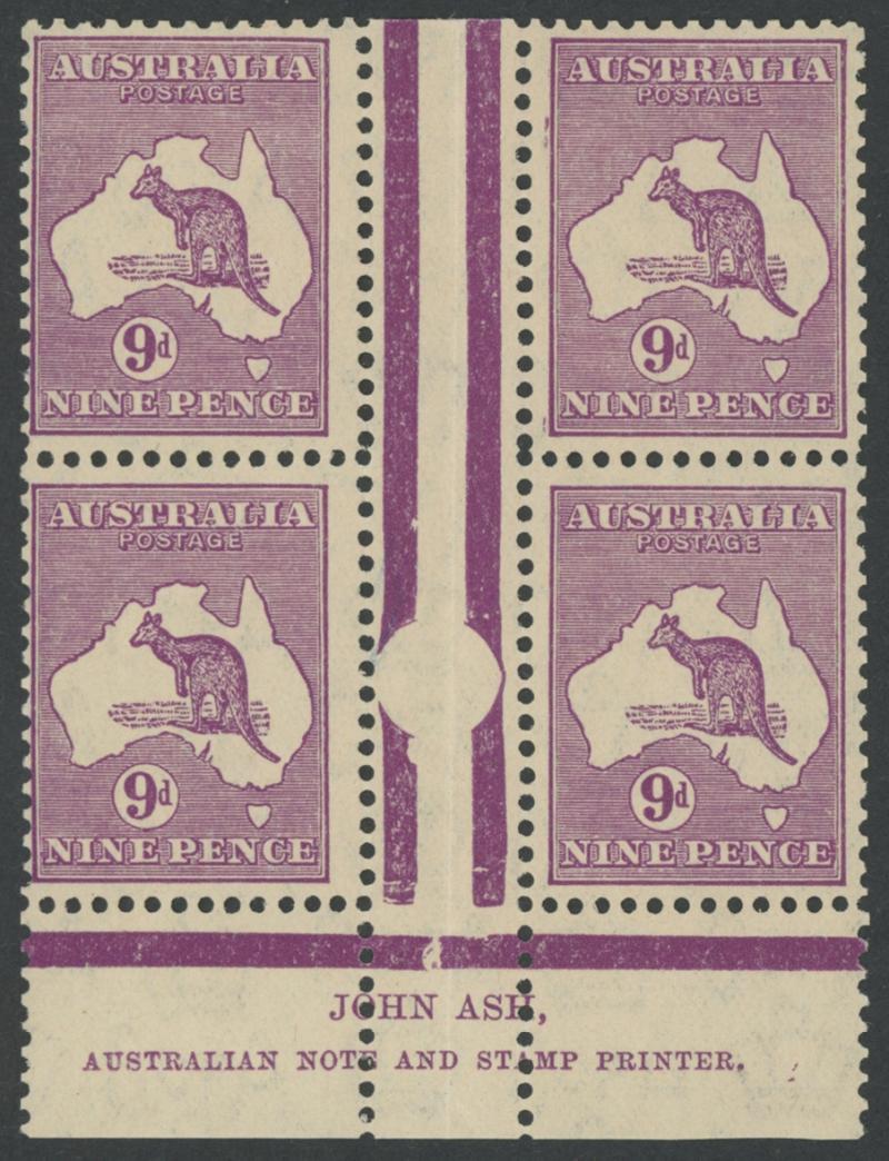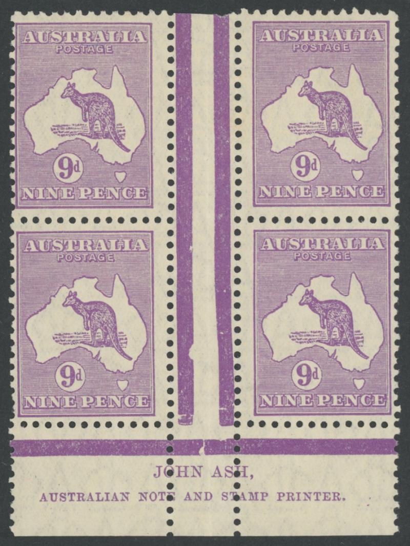 9d violet SG 108 Plate 4 (lower) John Ash Imprint block of 4 ACSC 28(4)z, lightly mounted in the lower margin only, the stamps