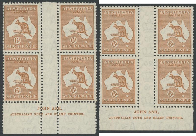 6d chesnut SG 132 John Ash Imprint blocks of 4 from both Plate 3 ('N' over 'N') and Plate 4 ('N' over 'A') ACSC 23(3)z & (4)z, the