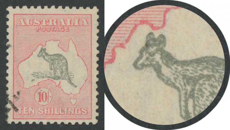 10/- grey and pink SG 136 with Weeping Kangaroo [Pos L41] ACSC 50(V)l, small part cds cancel well clear of the variety, Cat $550. (Image1) (Image2)