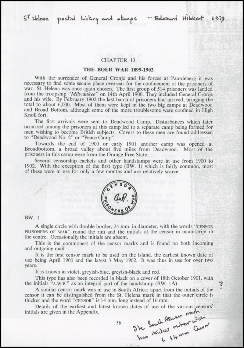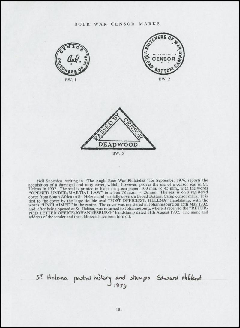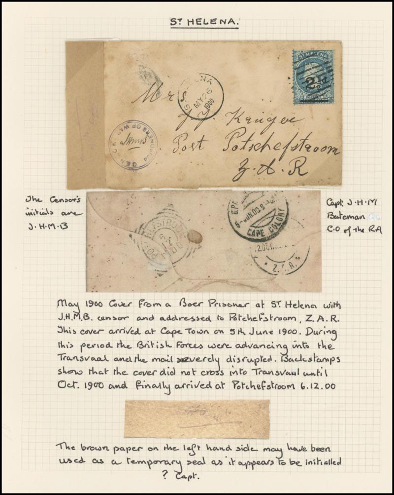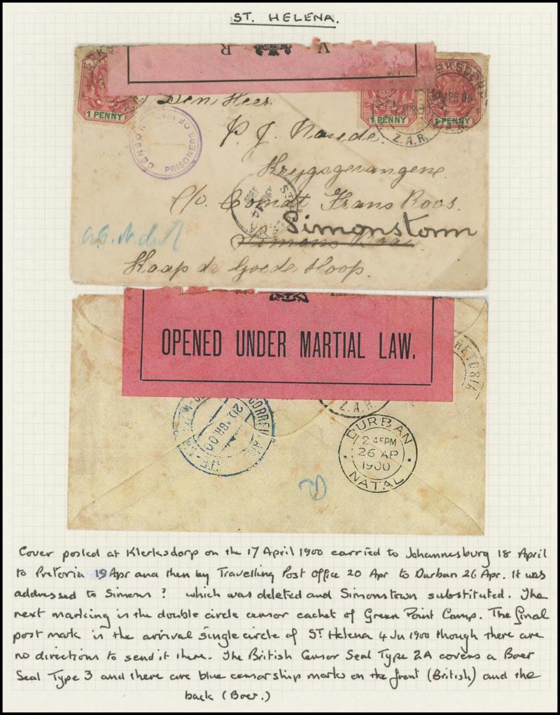 CAMP' & oval 'REGISTERED/ST HELENA', cover with the censor cachet & "EW", censor cover to France with Keyplate ½d & 'TWO PENCE' on 6d yellow, cover to Transvaal with 'CENSOR/("JMHB")/PRISONER OF WAR' & '2½d' on 6d blue, covers from South Africa to