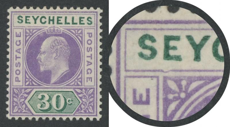 1903 KEVII Keyplates Crown CA Watermark 30c violet & green with Dented Frame below 'E' of 'SEYCHELLES' ('Glover' Flaw) SG 52a,