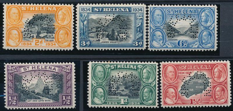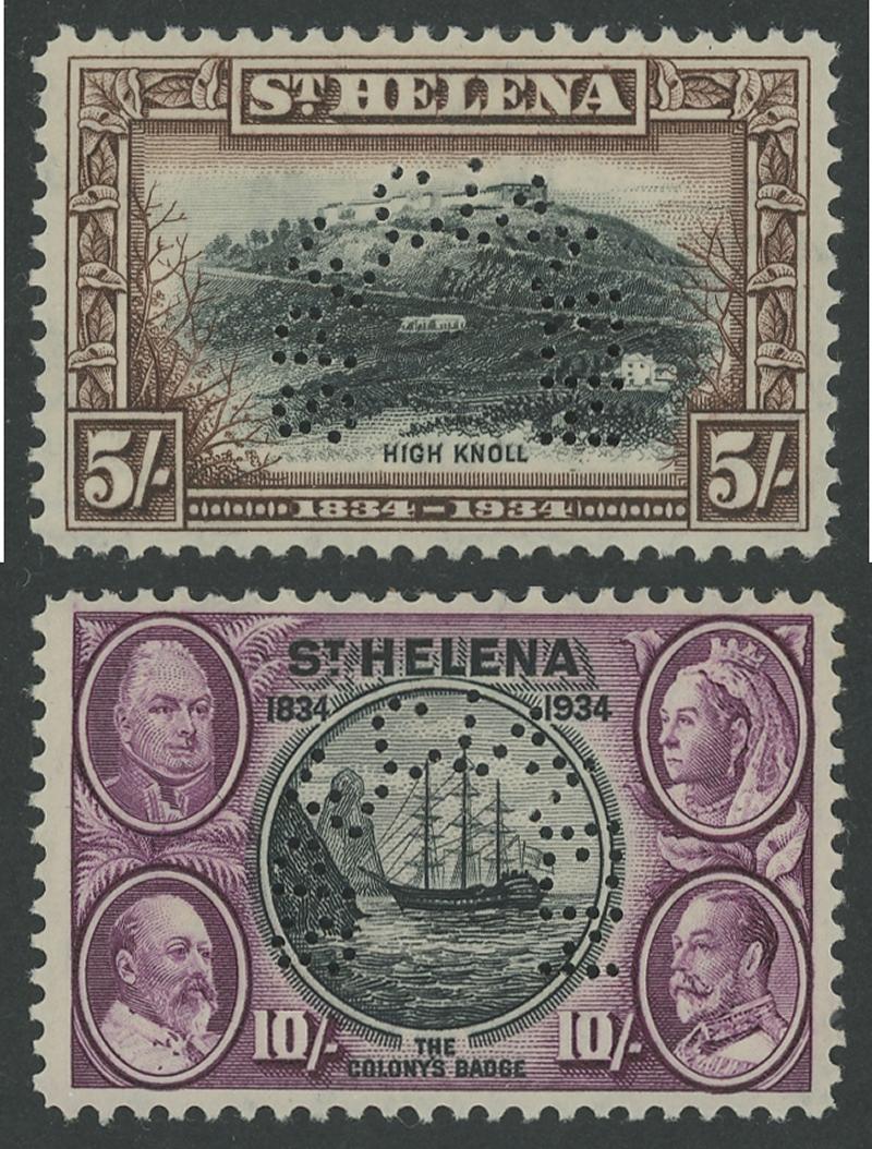 1934 Centenary of British Colonisation Pictorials ½d to 10/- set with horseshoe 'SPECIMEN' punctures SG 114-123, generally