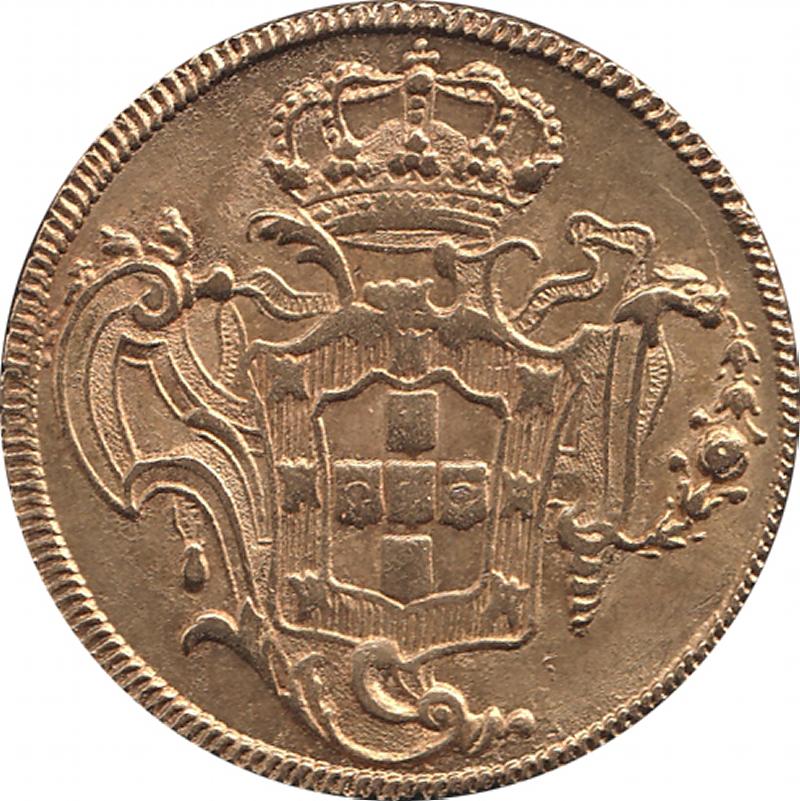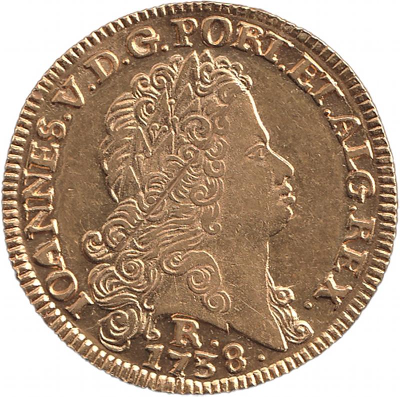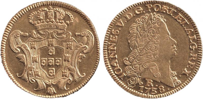 Brazil Half-Johanna (£2) 1738 John V gold (14.26g 0.917) 4 Escudos or 6,400 Reis, mintmark 'R' Rio Brazil, Friedburg 46, KM 149,