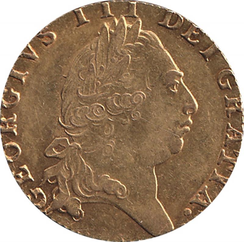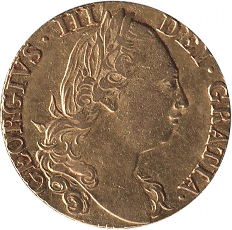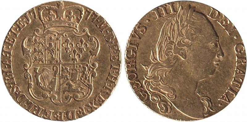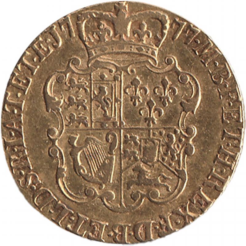 Great Britain Guinea (£1/2/-) 1777 George III Fourth Head gold (8.35g 0.917) Spink 3728, KM 604, rev. Crowned Arms, VF. (Image1) (Image2)