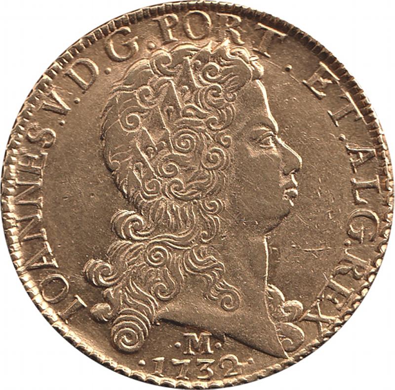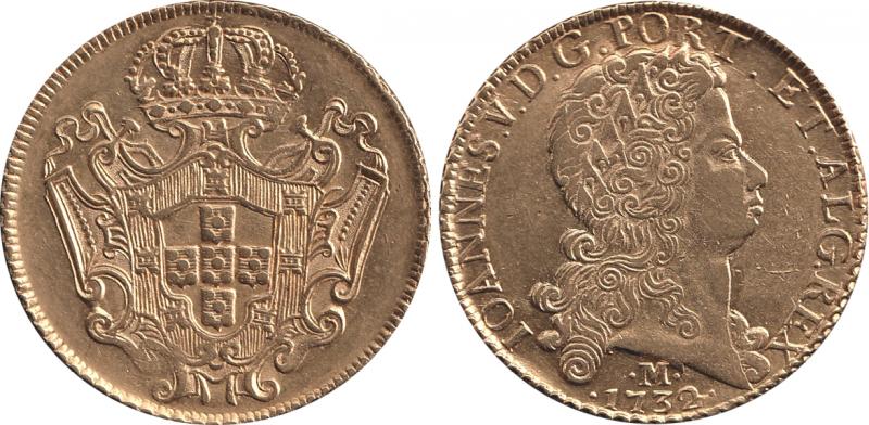 Brazil Johanna (£4) 1732 John V gold (28.57g 0.917) 8 Escudos or 12,800 Reis, mintmark 'M' Minas Gerais Brazil, Friedburg 55, KM